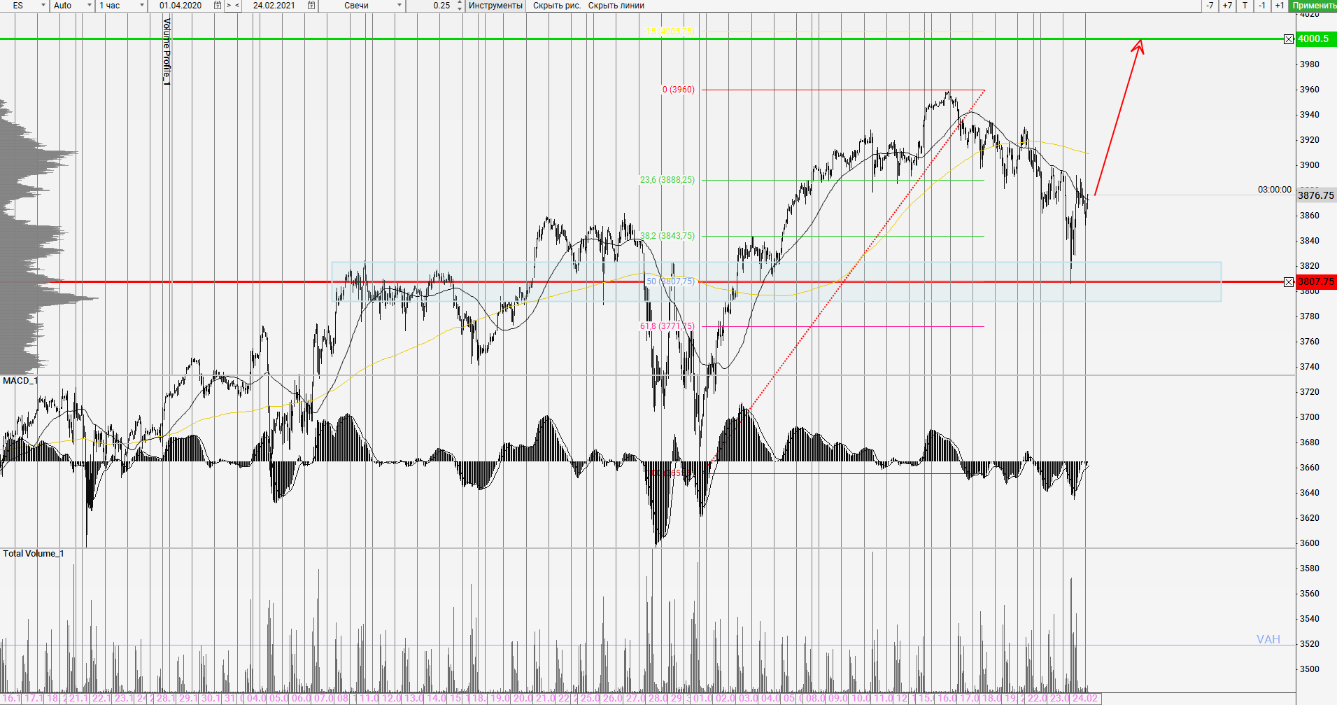 Последние несколько дней индексы корректировались. Главный индекс Америки – СП500, протестировал 50% фибо к предыдущей волне роста и начинает восстанавливаться. Стоит отметить, что вчера рынок увидел кульминационные обьемы торгов, что говорит о начале новой волны роста. Мы ожидаем, что ближайшая цель роста котировок данного индекса находится на отметке 4000.
