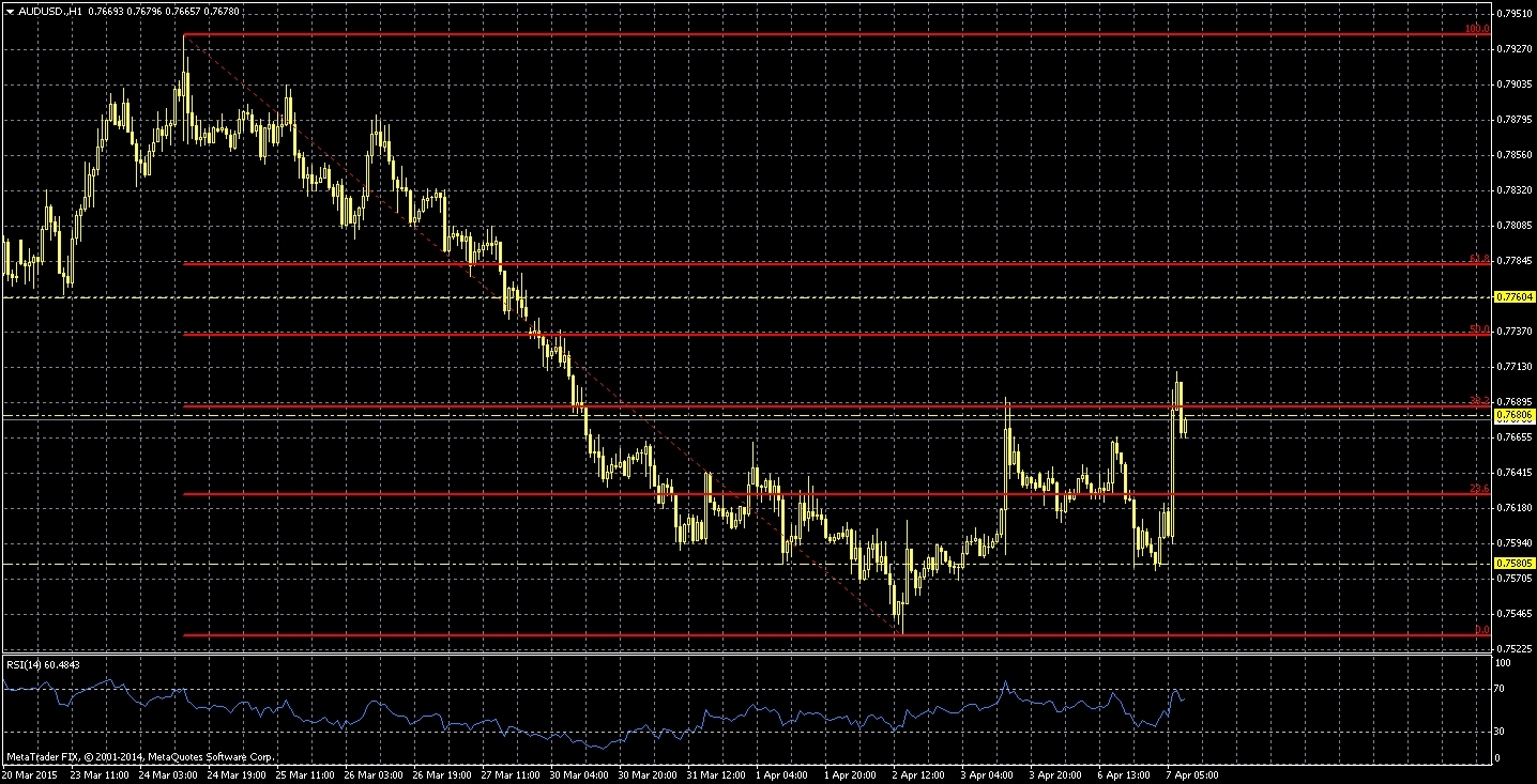 Сегодняшнее решение РБА по процентной ставке Австралии осталось неизменным на уровне 2.25%. Плюс позитивные данные по объёмам розничных продаж спровоцировало восходящее движение. Пробой уровня 0.7680 и фиксация цены выше, может открыть нам цель до следующей линии сопротивления 0.7760.