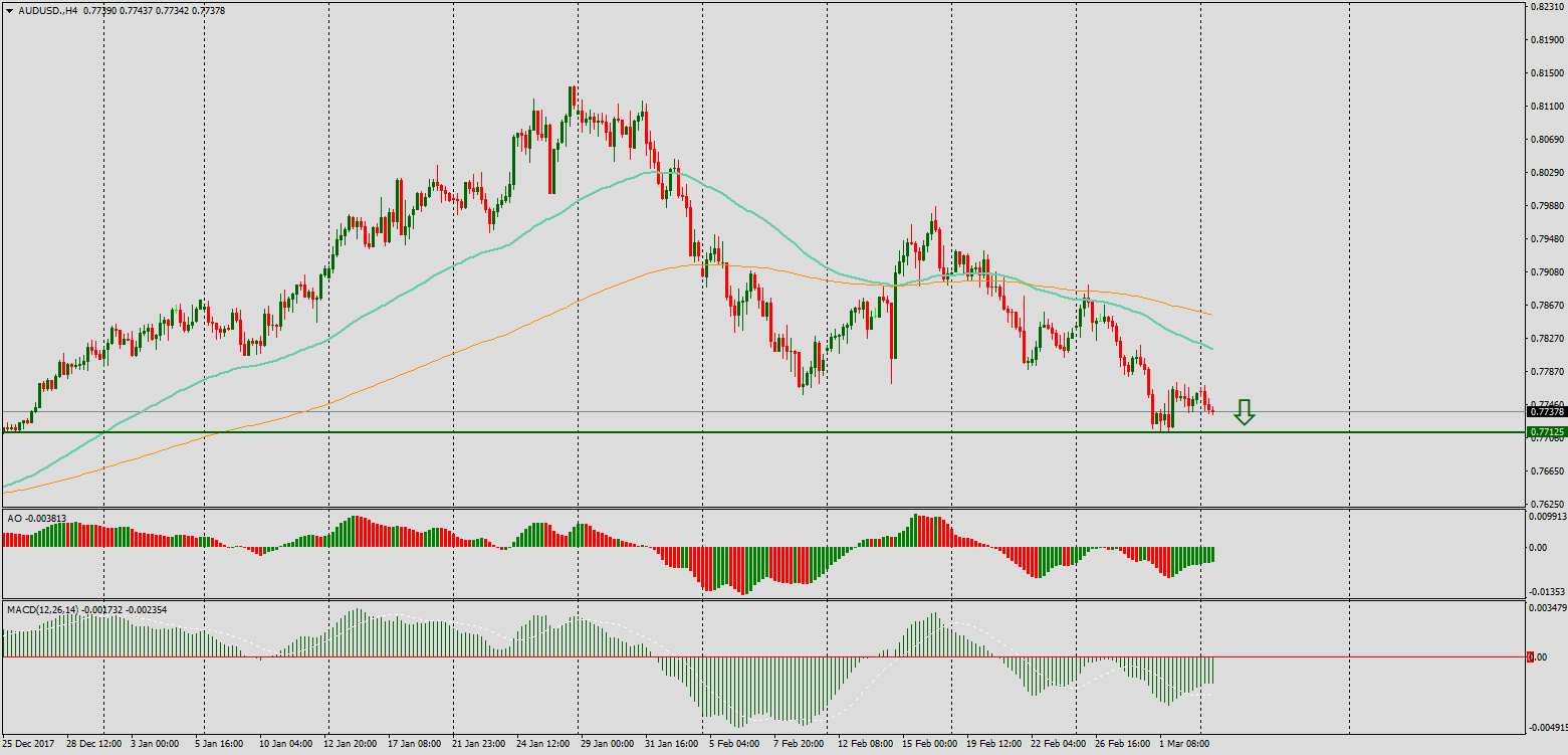 По состоянию на утро, 05 марта, ценовая отметка по валютной паре AUD/USD находится в диапазоне 0,7734 - 0,7743. Рассматриваем исключительно продажи, так как валютная пара пребывает в состоянии локального нисходящего тренда. Открытие ордеров после пробития уровня 0,7712.