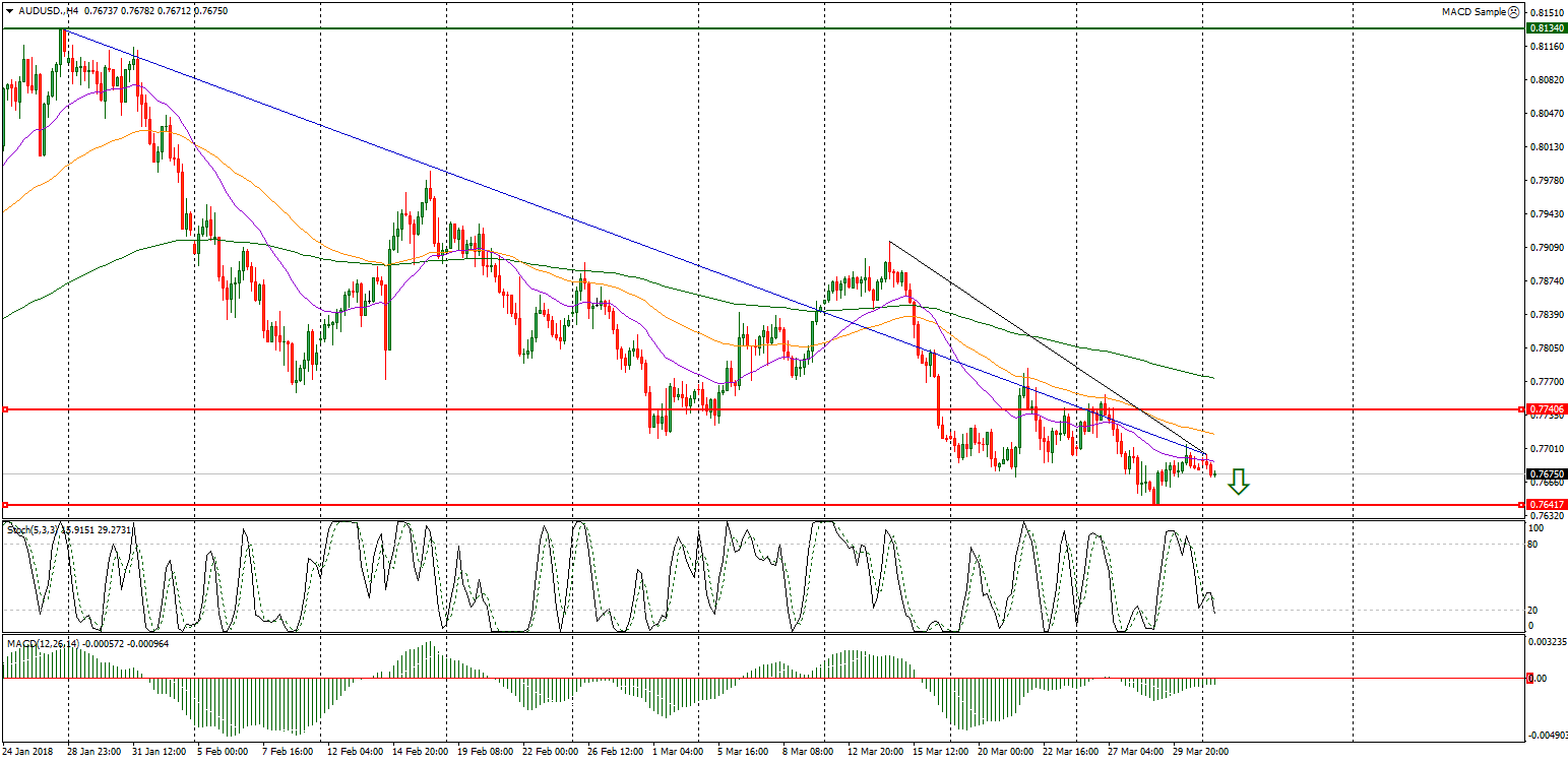 По состоянию на утро, 02 апреля, ценовая отметка по валютной паре AUD/USD находится в диапазоне 0,7671 - 0,7686. Так как валютная пара пребывает в состоянии локального низходящего тренда, то рассматриваем открытие ордеров на продажу, однако после пробития уровня сопротивления 0,7641.