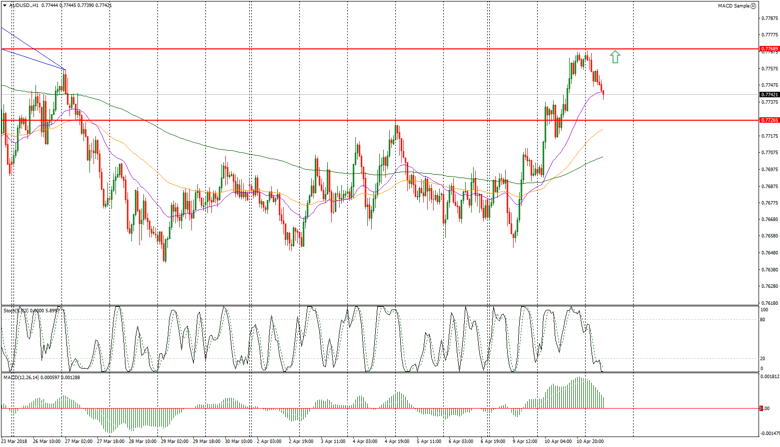 По состоянию на утро, 11 апреля, ценовая отметка по валютной паре AUD/USD находится в диапазоне 0,7743 - 0,7750. Рассматриваем исключительно покупки, однако после пробития ближайшего уровня сопротивления 0,7768.