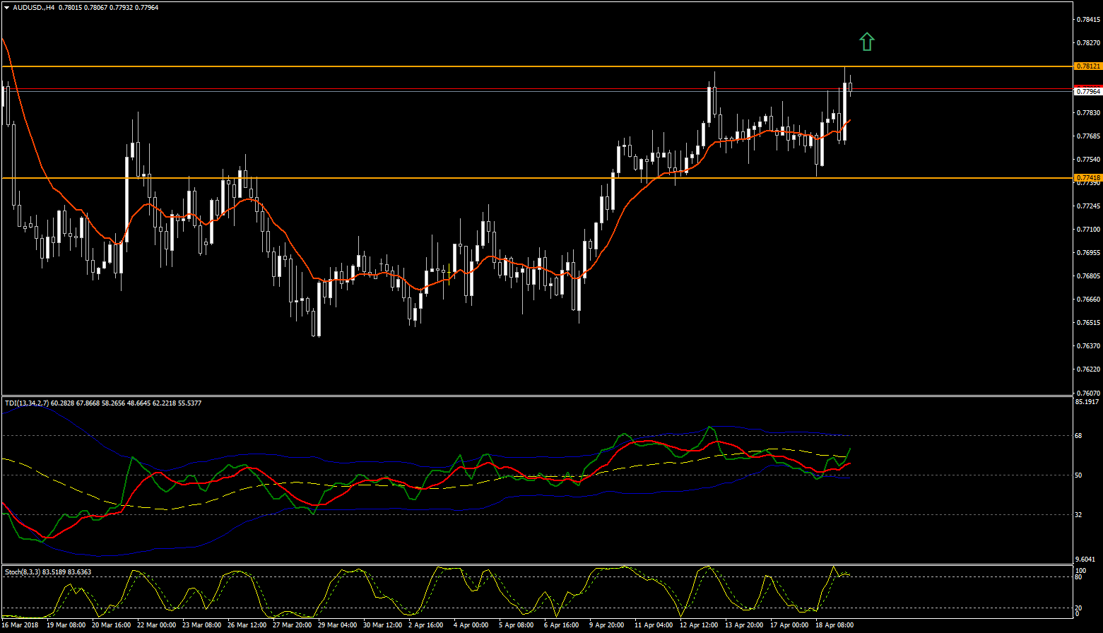 По состоянию на утро, 19 апреля, ценовая отметка по валютной паре AUD/USD находится в диапазоне 0,7793 - 0,7806. Рассматриваем покупки после пробития уровня сопротивления 0,7812.