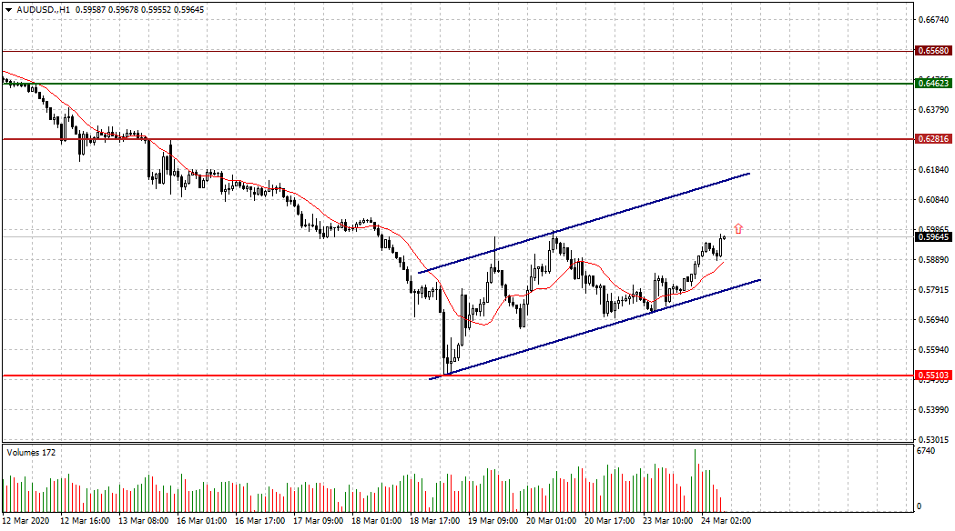 По состоянию на утро, 24 марта, ценовая отметка по валютной паре AUD/USD торгуется в диапазоне 0,5898 - 0,5973. Так как цена пребывает в рамках восходящей тенденции, рассматриваем открытие сделок на покупку. Таргет отметка 0,6281.