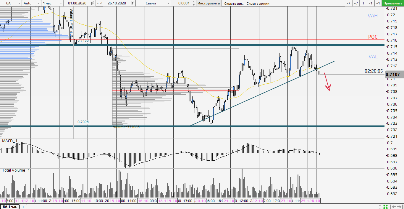 По состоянию на утро 26 октября, ценовая отметка по инструменту торгуется в диапазоне 0,7107-0,7113. Рассматриваем продажи. Вход в рынок с текущих цен. Таргет отметка - уровень 0,7025.