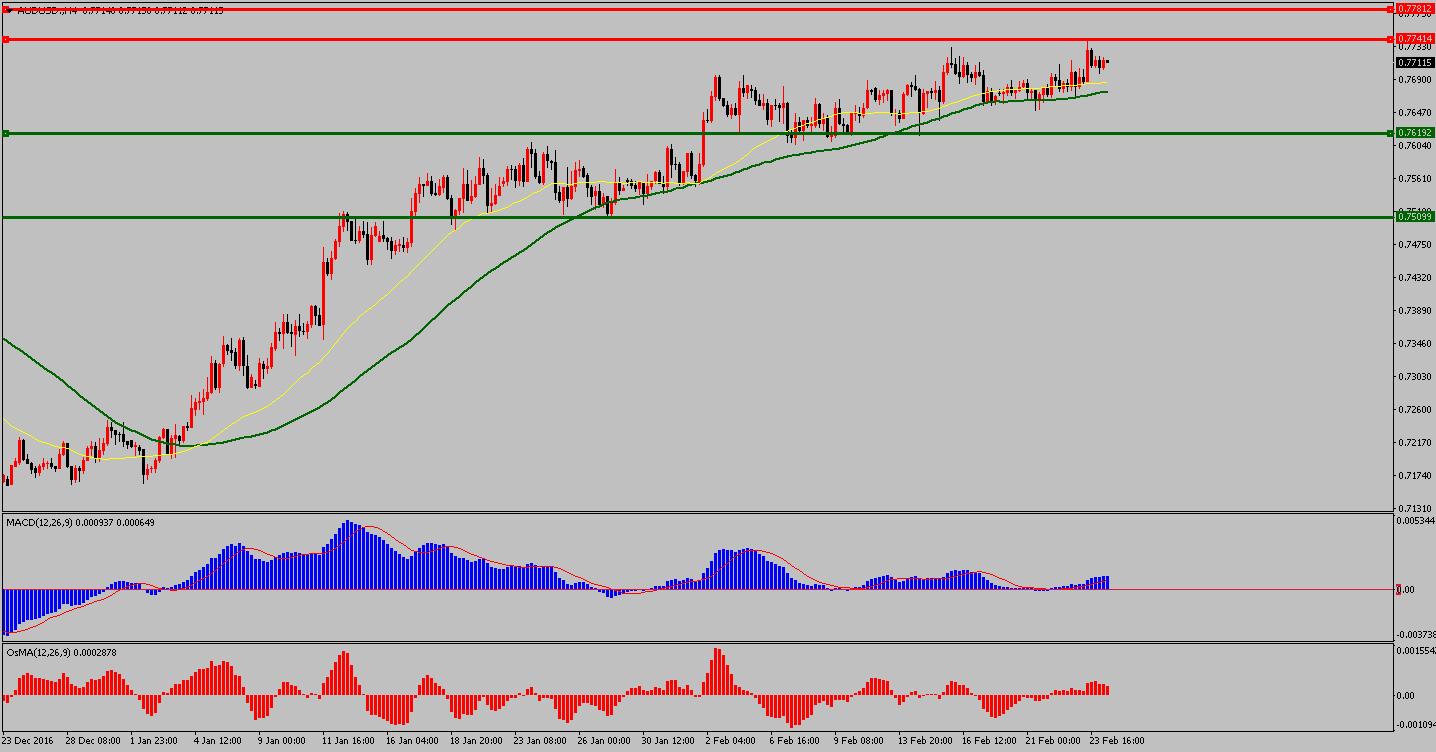 По состоянию на утро, 24 февраля, валютная пара AUD/USD торгуется в диапазоне 0,7702 - 0,7718, под уровнем сопротивления 0,7741. В случае пробития уровня сопротивления вверх, стоит открывать ордера на покупку.