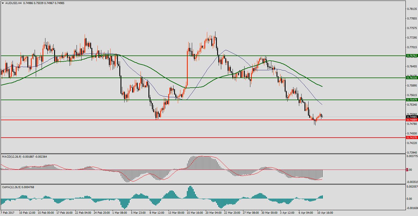 По состоянию на утро, 11апреля, AUD/USD торгуется в диапазоне 0,7496 - 0,7503. Технически валютная пара пребывает в локальном низходящем тренде и ближайшей целью выступает уровень сопротивления 0,7490. В случае пробития уровня вниз, стоит открывать ордера на SELL.