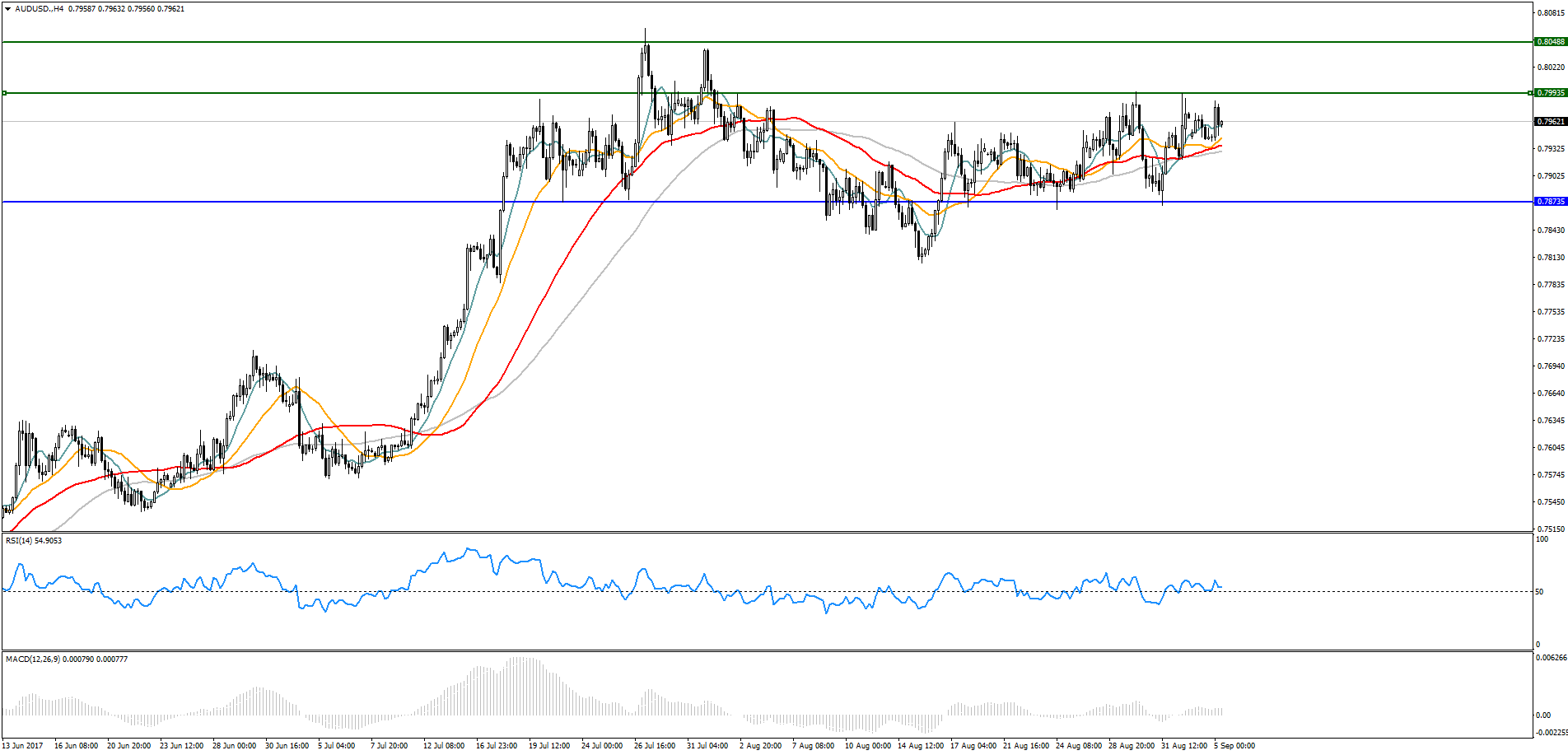 По состоянию на утро, 05 сентября, AUD/USD торгуется в диапазоне 0,7956 - 0,7961. На текущий момент сформировалась локальное сопротивление 0,7993. В случае пробоя данного уровня, открываем ордера на покупку.