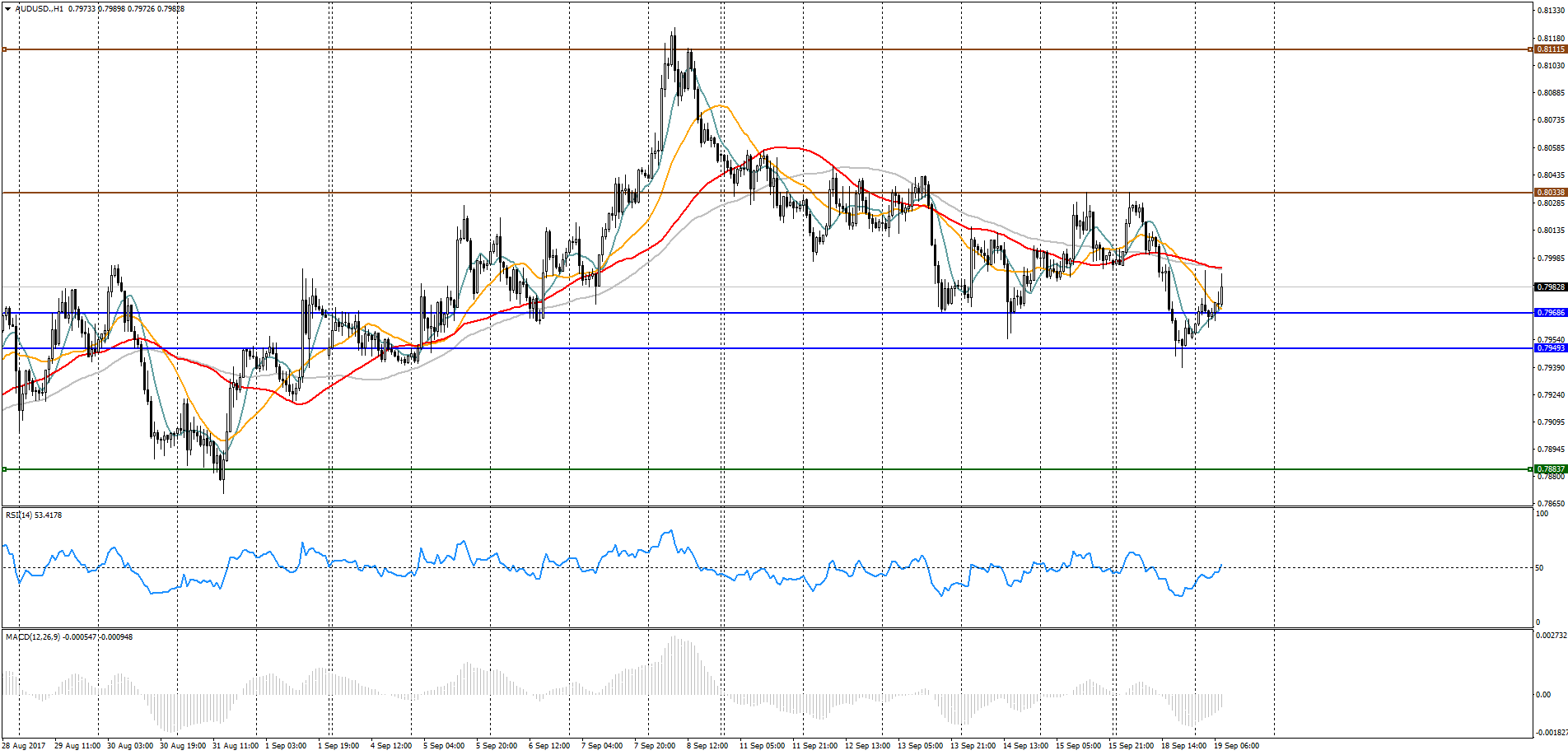 По состоянию на утро, 19 сентября, AUD/USD торгуется в диапазоне 0,7972 - 0,7989. Существует два сценария развития событий. В случае пробоя отметки 0,8033 открываем покупки - ТР 0,8115. При пробитии поддержки 0,7949 открываем ордера на sell – ТР 0,7883.