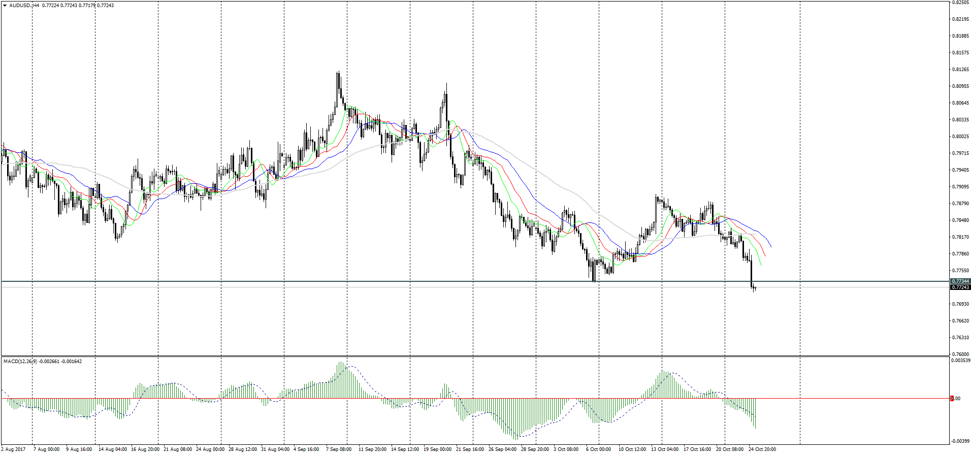 По состоянию на утро, 25 октября, AUD/USD торгуется в диапазоне 0,7717 - 0,7722. На текущий момент наблюдается локальный нисходящий тренд. Так как был пробит уровень поддержки 0,7734, то рассматривать стоит исключительно продажи.