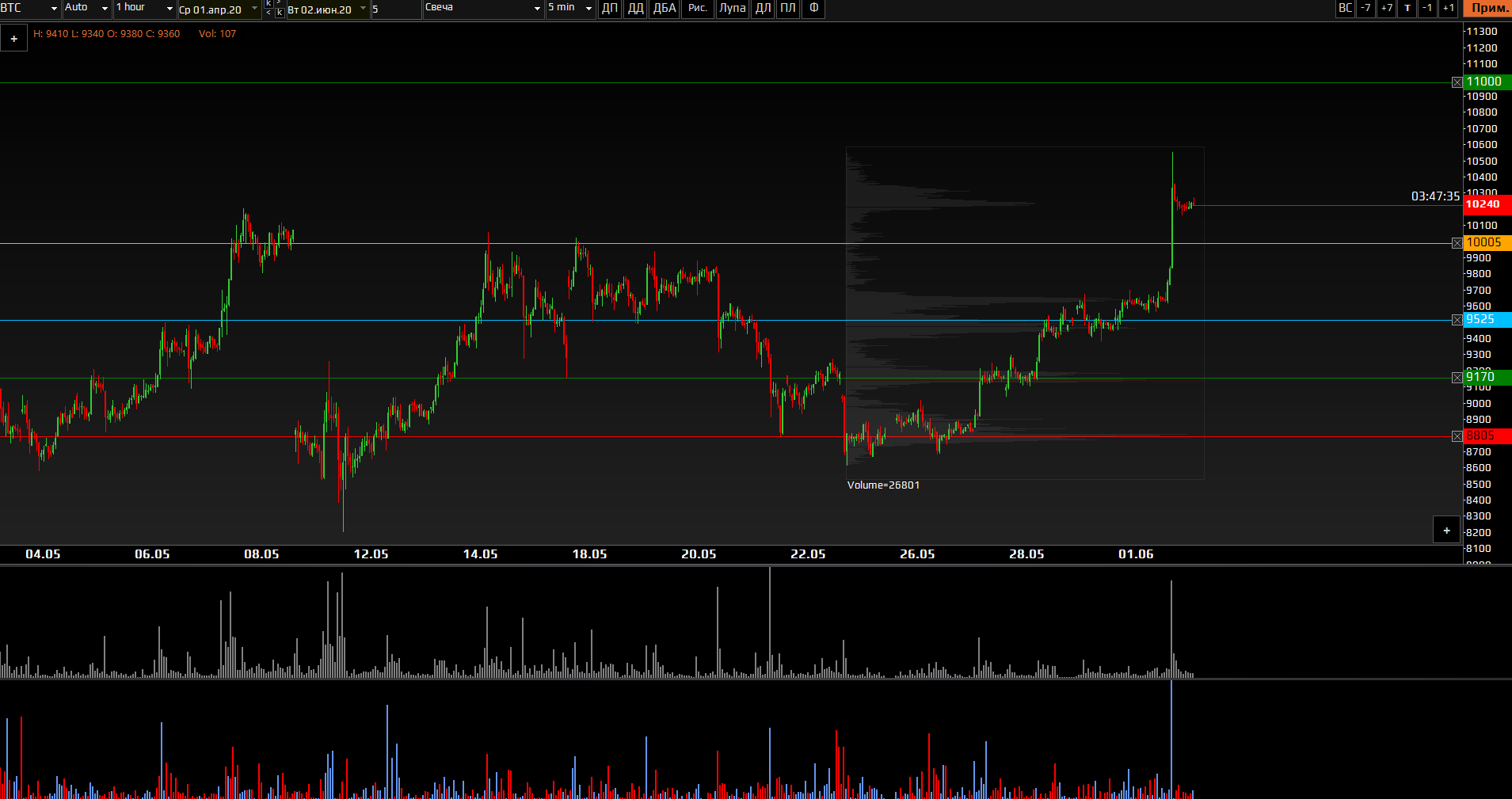 Биткоин вновь торгуется выше 10000. Стоит отметить, что потенциал роста в еще одном импульсе сохраняется. Потенциальной целью роста может быть уровень 11000. Стоит заметить, что основные обьемные поддержки расположены на уровнях 9520, 9170 и 8805.