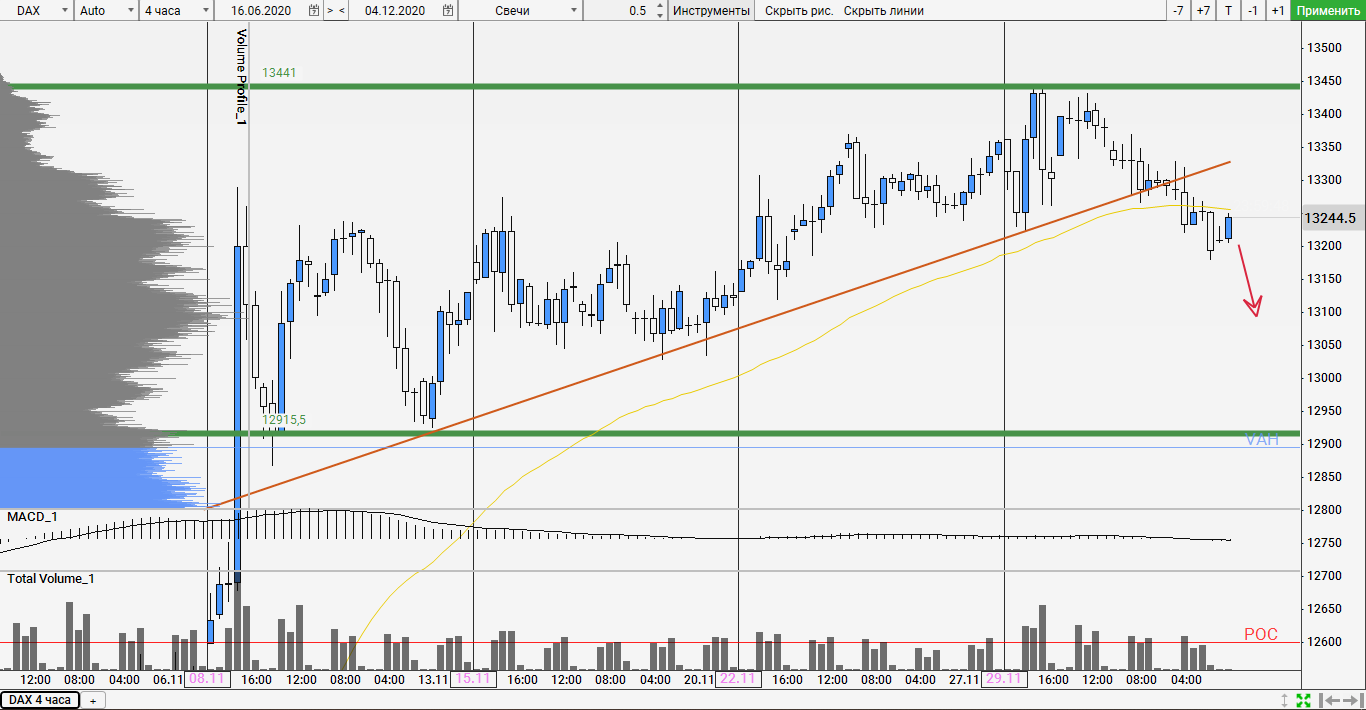 Инструмент DAX скорректировался, снизился, пробив линию поддержки. По состоянию на 04 декабря, ценовая отметка по DAX торгуется в диапазоне 13209-13251. Рассматриваем краткосрочные продажи. Вход в рынок с текущих позиций.