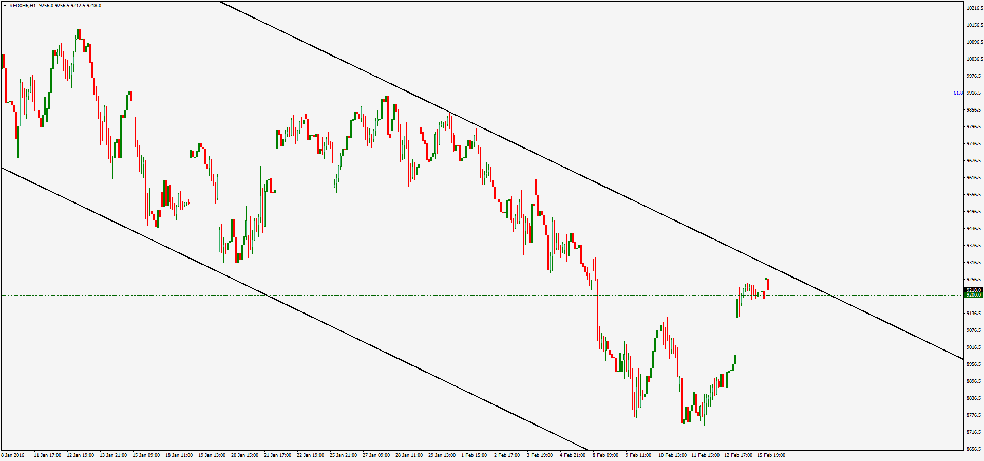 Немецкий индекс DAX30 после хорошего падения показывает плавное восстановление. Цена тестирует уровень сопротивления 9200, подойдя вплотную к верхней границе нисходящего тренда. Пробой данного канала и фиксация цены за его пределами откроет нам хорошие цели 9890 – 1000.