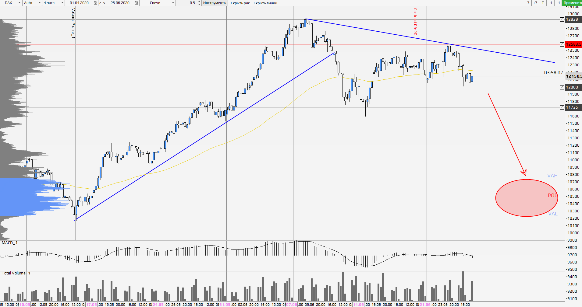 После восходящего тренда покупатели разгрузили свои позиции выше отметки 12000. Стоит отметить, что сопротивление на текущий момент расположено на отметке 12583, а обьемная поддержка 12000 – 11725. Мы видим потенциал дальнейшего падения котировок после пробоя вниз указанной поддержки. В этом случае падение может дойти до зоны накопления 10800 – 10200.