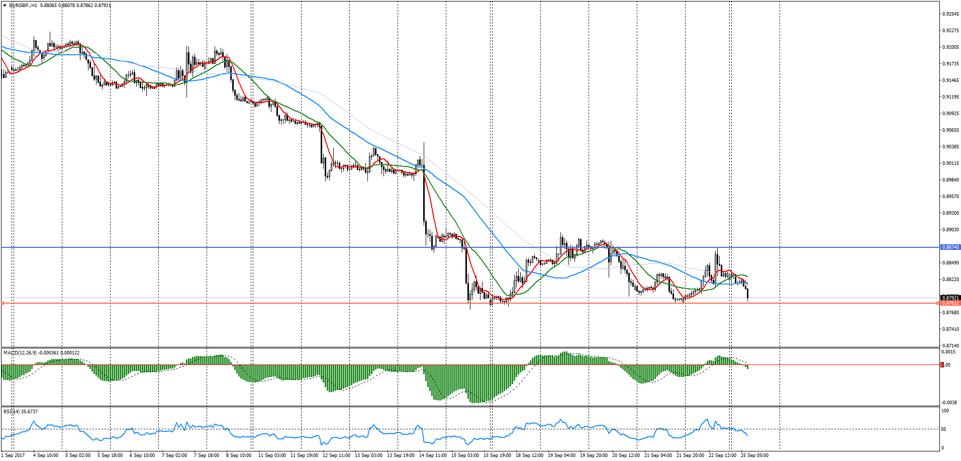 По состоянию на утро 25 сентября EUR/ GBP торгуется в диапазоне 0,8786 - 0,8807. Так как валютная пара пребывает в стадии нисходящего тренда, рассматриваем исключительно продажи. Однако после пробития уровня 0,8783 входим в рынок.
