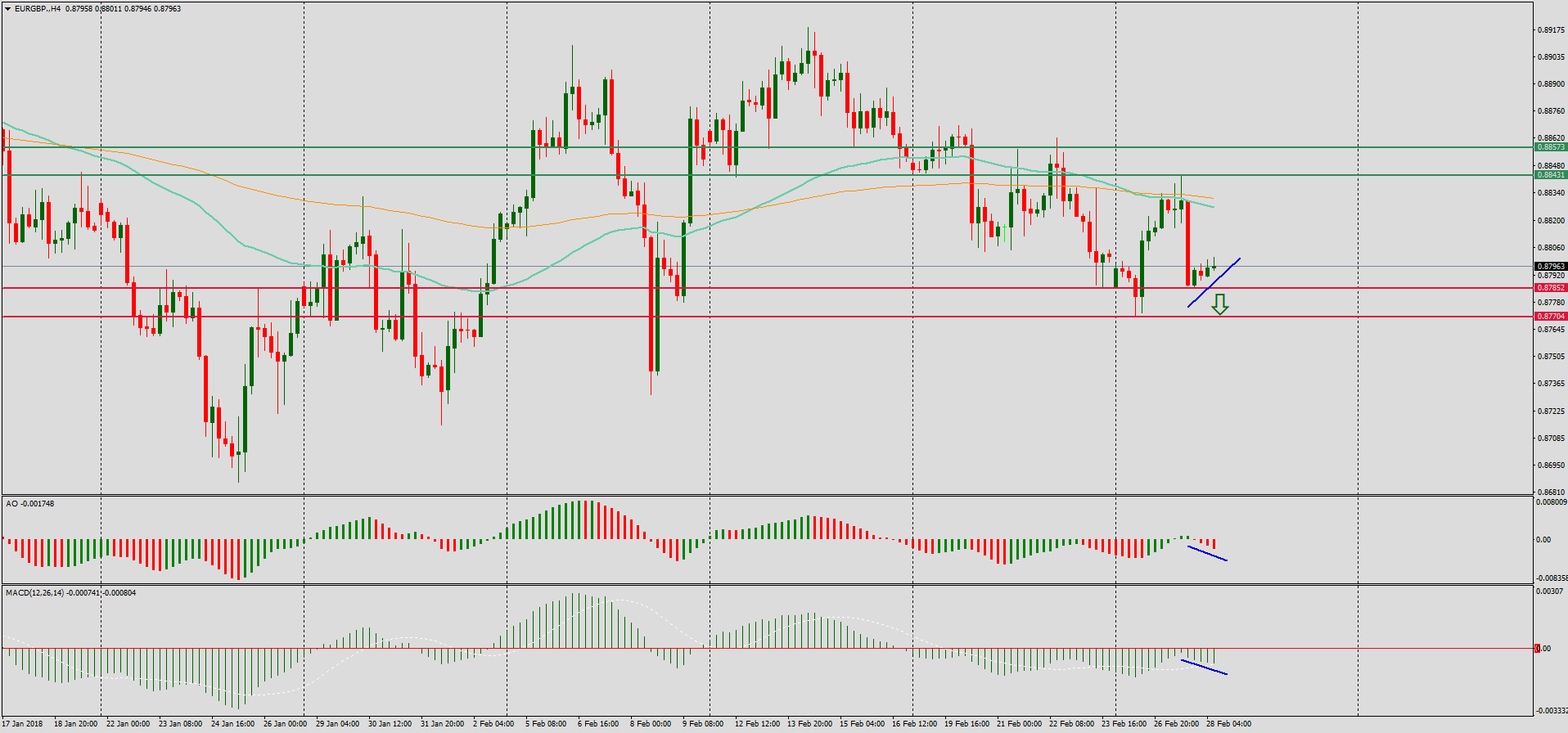 По состоянию на утро 28 февраля ценовая отметка по валютной паре EUR/ GBP находится в диапазоне 0,8794 - 0,8801. Рассматриваем исключительно продажи, так как технические индикаторы показывают вероятное движение вниз. Подтверждением для открытия позиций послужит пробой уровня 0,8785.