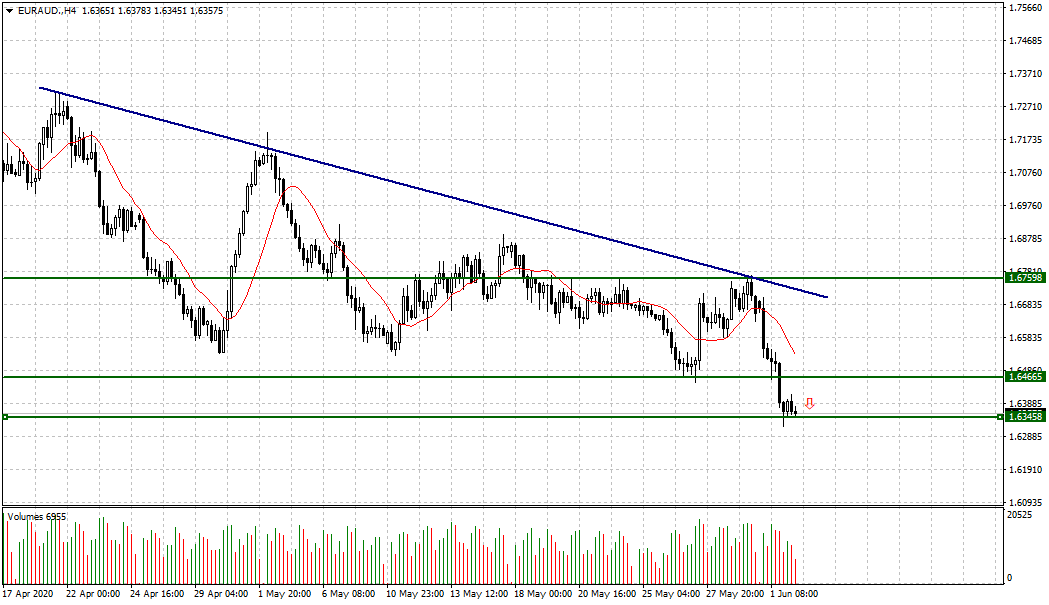 По состоянию на утро, 02 июня, ценовая отметка по валютной паре EUR/AUD торгуется в диапазоне 1,6354 - 1,6414. Так как валютная пара пребывает в рамках низходящей тенденции, то рассматриваем открытие сделок на продажу. Для входа в рынок ожидаем пробитие уровня вниз.