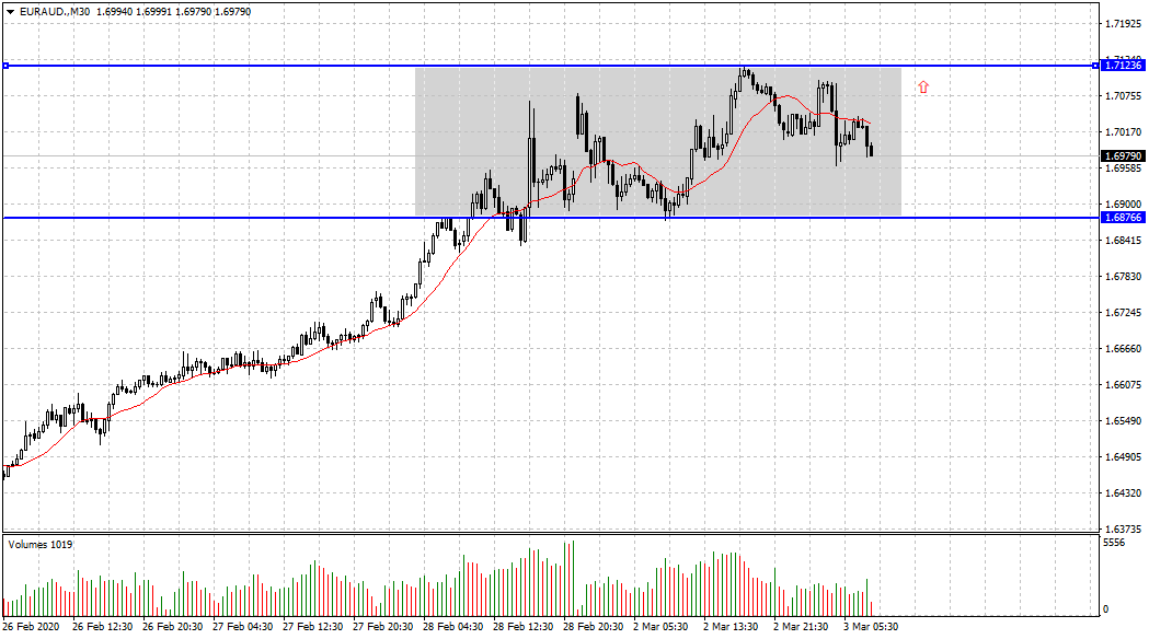 По состоянию на утро, 03 марта, ценовая отметка по валютной паре EUR/AUD торгуется в диапазоне 1,6976 - 1,7027. Рассматриваем открытие сделок на покупку. Пробитие уровня 1,7123 и фиксация цены над ним, будет сигналом к открытию сделок на покупку.