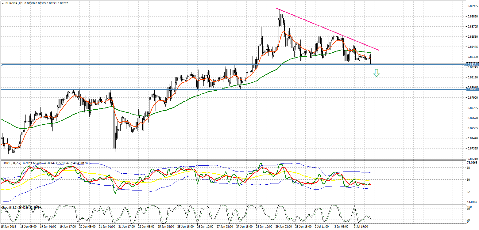 По состоянию на утро, 04 июля, ценовая отметка по валютной паре EUR/GBP торгуется в диапазоне 0,8733 - 0,8740. В данный момент рассматриваем продажи. Входим в рынок после пробоя уровня 0,8827. Таргет отметка 0,8799.