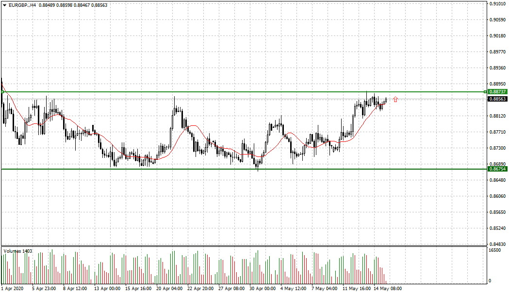 По состоянию на утро, 15 мая, ценовая отметка по валютной паре EUR/GBP торгуется в диапазоне 0,8841 - 0,8851. Так как валютная пара пребывает в рамках равноудаленного бокового канала, то рассматриваем открытие сделок после выхода из консолидации. Для входа в рынок ожидаем пробитие уровня вверх. Выход из консолидации и фиксация цены над ним, будет сигналом к открытию сделок на покупку.