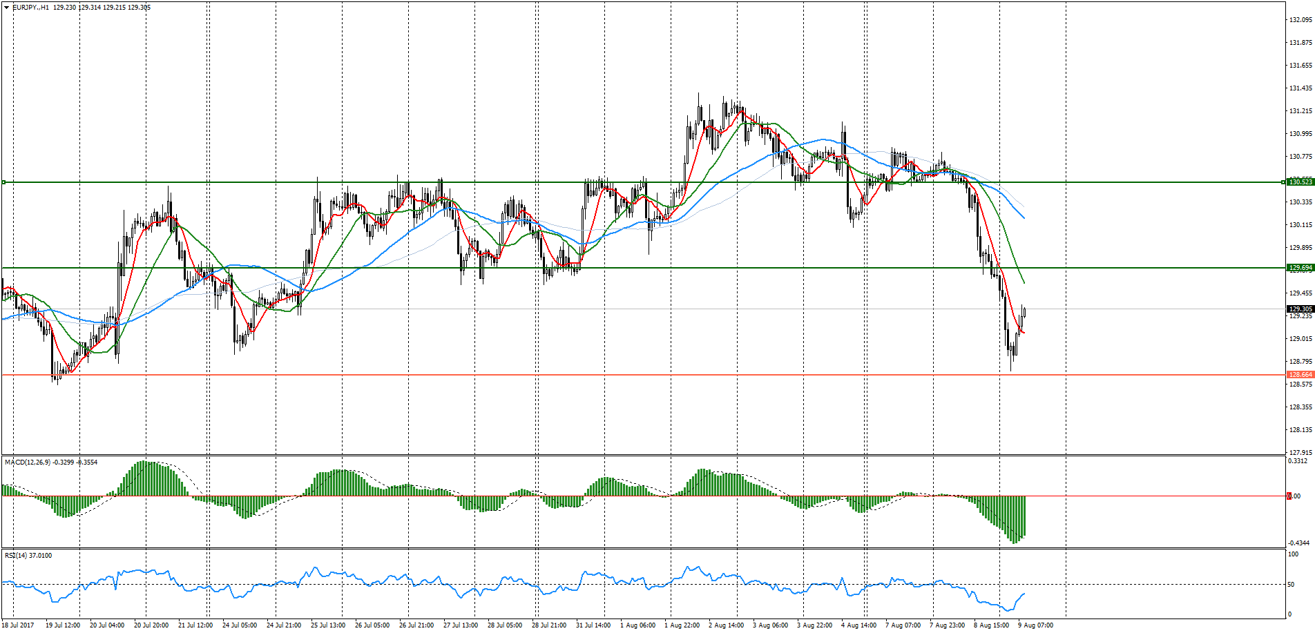По состоянию на утро, 09 августа, валютная пара EUR/JPY торгуется в диапазоне 129,21 — 129,27. Ближайшей целью выступает сопротивление 129,69. Если случится уверенный пробой данного уровня, то стоит рассматривать открытие ордеров на покупку.