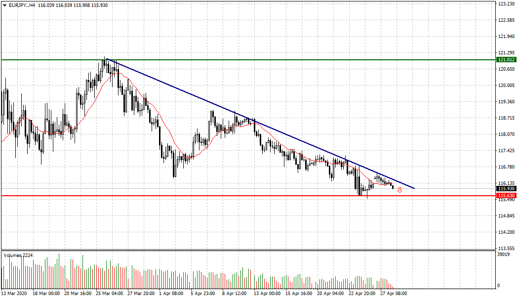 По состоянию на утро, 28 апреля, ценовая отметка по валютной паре EUR/JPY торгуется в диапазоне 115,90 - 116,03. Так как валютная пара пребывает в рамках равноудаленного бокового канала, рассматриваем открытие сделок на продажу. Ожидаем пробитие сформировавшегося уровня поддержки 115,63. Пробитие цены вниз с последующей фиксацией под уровнем, будет сигналом к открытию сделок на продажу.