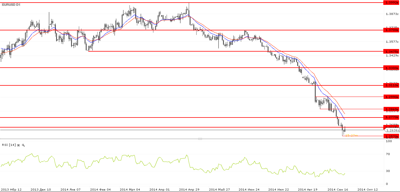 Валютная пара EUR/USD смогла закрепиться ниже уровня 1,2860, и продолжить свое нисходящее движение. В данный момент медведям удалось пробить уровень поддержки 1,2770 (исторические минимумы от 24.03.2013 года), в случае закрепления ниже данного уровня единая валюта сможет продолжить падение к ближайшей поддержке на уровне 1,2675.