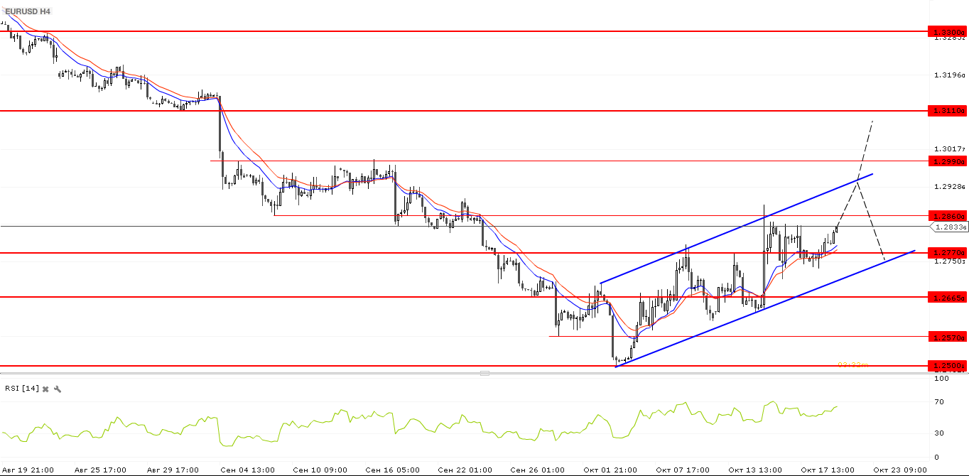 - При отскоке от верхней границы данного канала ближайшей целью коррекции выступит уровень 1,2860, далее уровень поддержки в районе 1,2770 с последующим тестированием нижней границы восходящего канала на уровне 1,2730.