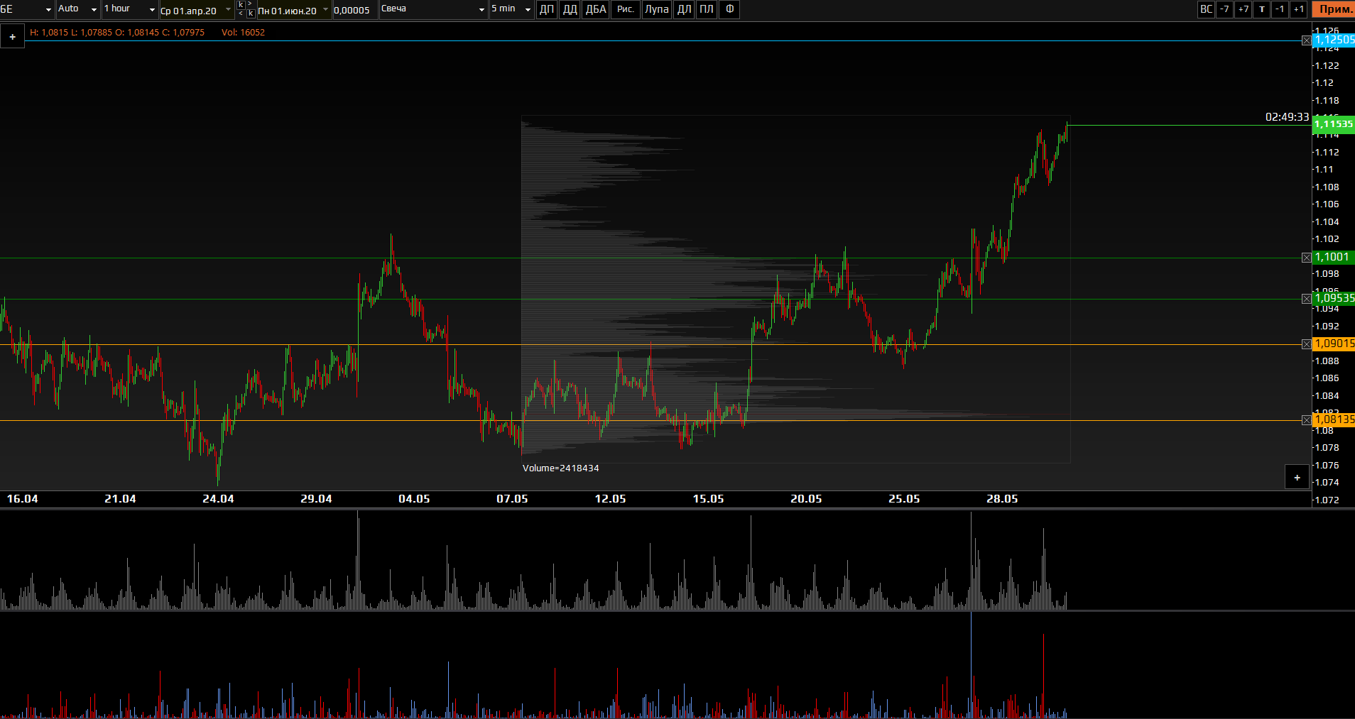 Евродоллар продолжает расти. Стоит отметить, что настрой толпы указывает на продажи, что говорит, о том, что потенциал роста котировок сохраняется. На графике выделены основные обьемные поддержки 1,1000 – 1,0953 и 1,0900 – 1,0813. На данный момент существует вероятность незначительной коррекции, после чего рост котировок продолжится. Целью роста можно отметить сопротивление 1,1250.