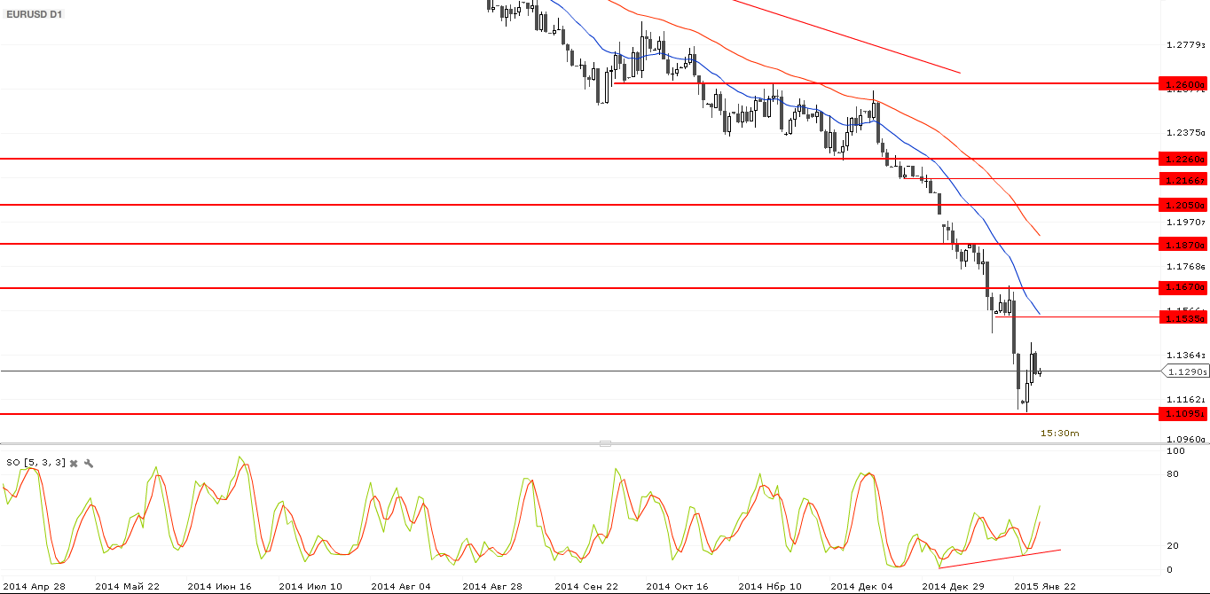 Обозначив минимум на уровне 1,1095, валютная пара EUR/USD продолжает корректироваться. Осциллятор Stochastic находится в зоне перепроданости, что говорит о продолжении текущей восходящей тенденции. Если обратить внимание на дневной график пары, то можно увидеть формирование дивергенции, что также говорит, как минимум, о прекращении текущего нисходящего тренда.