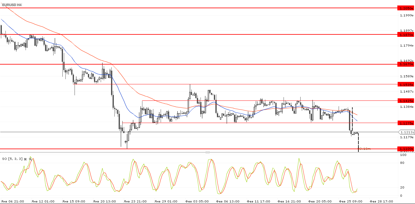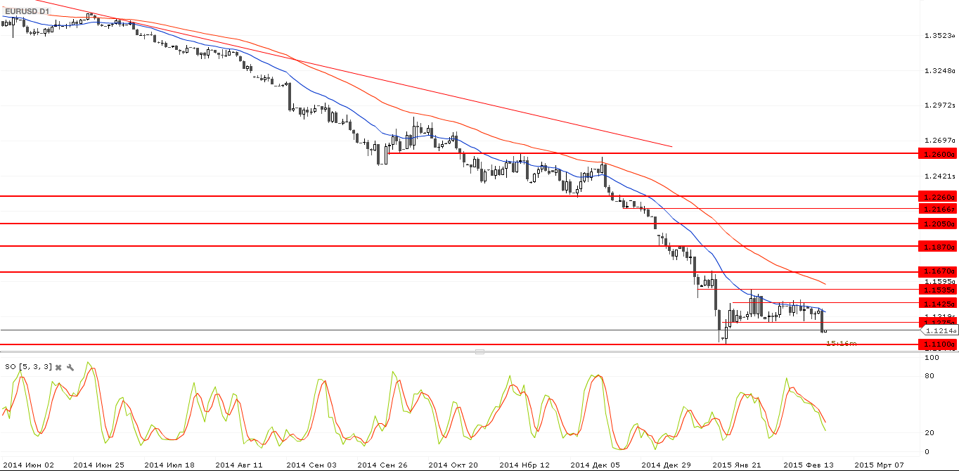 Да дневном графике пара не смогла закрепиться выше Moving Average с периодом 21, и в данный момент наблюдается отскок от указанного индикатора. Осциллятор Stochastic направлен вниз, что говорит о продолжении нисходящей тенденции. Таким образом, рекомендуем оставаться в коротких позициях или продавать валютную пару EUR/USD ниже уровня 1,1200 с целями нисходящего движения минимум к отметке 1,1100 пунктов.