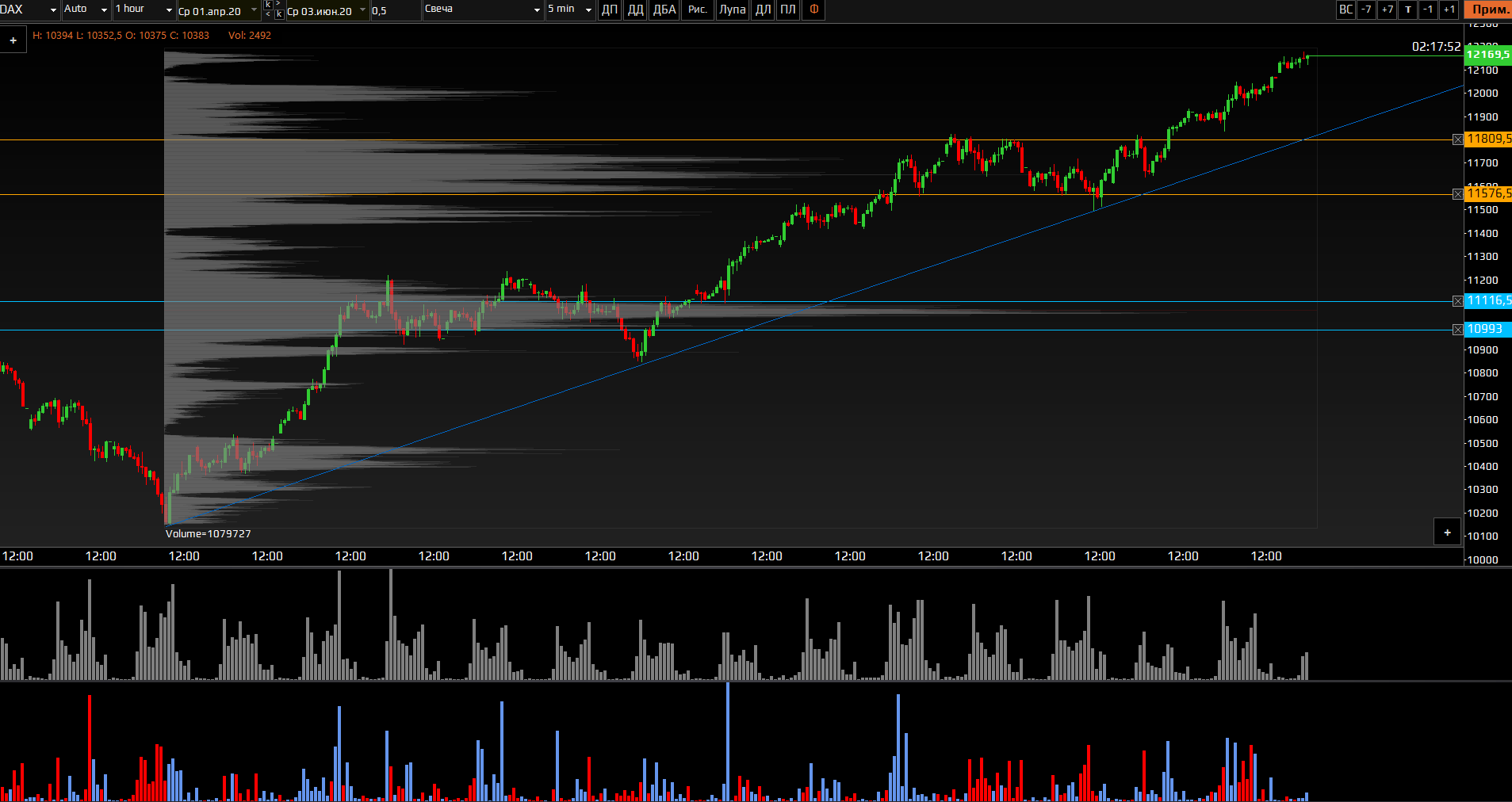 Индексы продолжают расти на фоне ультрамягкой монетарной политики и QE центральных банков. На графике вырисовывается сильный восходящий тренд, но начинают появляться признаки слабости – понижающиеся объёмы и дивергенции. Мы видим потенциальный план на продажу в этой ситуации – для этого надо дождаться пробоя линии тренда и ближайшего объёмного уровня 11809 – 11576. В этом случае мы увидим снижение цены и тест объемного скопления 11116 – 10993.