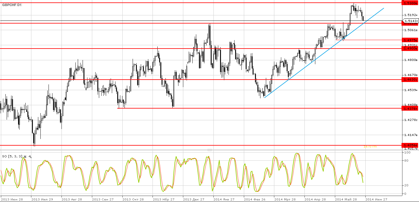 - В случае пробоя поддержки и линии восходящего тренда от 17.04.2014 года можно будет говорить о начале масштабной коррекции с ближайшей целью 1,4975 пунктов. Далее падение пары в среднесрочной перспективе может продлиться к уровню поддержке 1,4900.