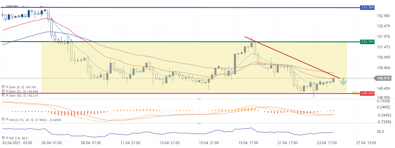 По состоянию на утро, ценовая отметка инструмента находится в диапазоне 149,73-149,98. Рассматриваем продажи, рекомендуемый риск на сделку 0.5% - 1%. Вход в рынок после пробития уровня сформировавшейся поддержки с последующей фиксацией под ней.