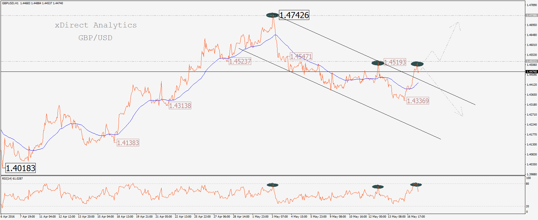 Вчера валютная пара фунт/доллар показала стремительный рост в рамках коррекционного движения к отметке 1.4520. Говорить об окончании нисходящего тренда пока рано, так как ключевой уровень 1.4520-1.4550 не пробит. Стоит обратить внимание на индикатор RSI, который показывает высокую вероятность окончания восходящего движения и возврат цены в нисходящий канал. Учитывая ситуацию на сейчас, мы имеем два сценария для торговли. Первый – продажа с текущих уровней с установкой стоп приказа за отметку 1.4550 и первой целью 1.43. Альтернативный сценарий – это покупка после пробоя и фиксации цены выше уровня 1.4520-1.4550. При классическом пробое данного уровня мы получим отличный заходной импульс для покупки, что автоматически вернет цену в восходящий тренд более старшего таймфрейма.