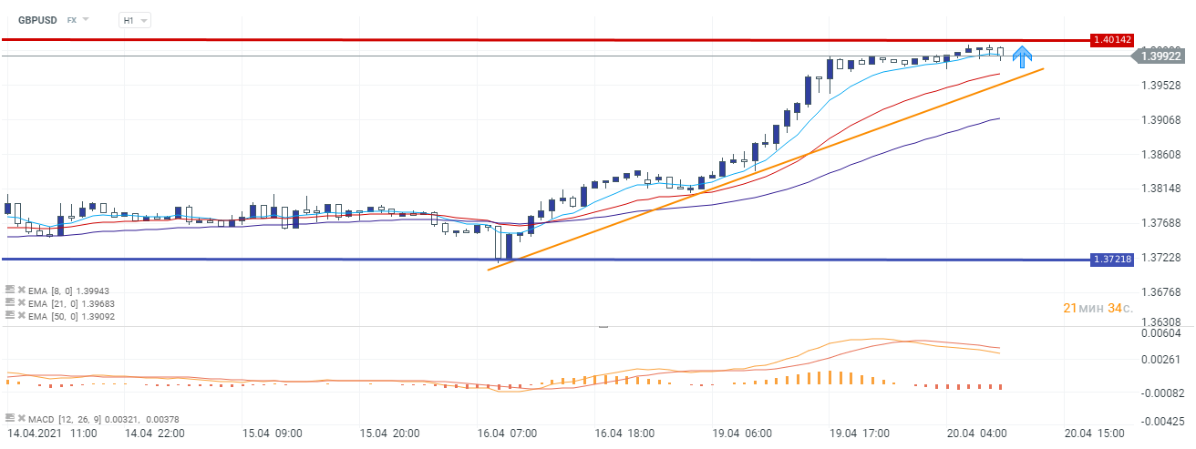 Инструмент GBP/USD торгуется вблизи уровня 1,4000. По состоянию на 20 апреля, ценовая отметка по инструменту торгуется в диапазоне 1,3986-1,4004. Рассматриваем покупки, рекомендуемый риск на сделку 0.5% - 1%. Вход в рынок после пробития уровня сформировавшегося сопротивления с последующей фиксацией над ним. Сегодня, офис национальной статистики Британии сообщил, что уровень заявлений безработных на трудоустройство составил 10,1К, что оказалось значительно лучше прогноза 24,5К. Низкий показатель является позитивным для британской валюты.