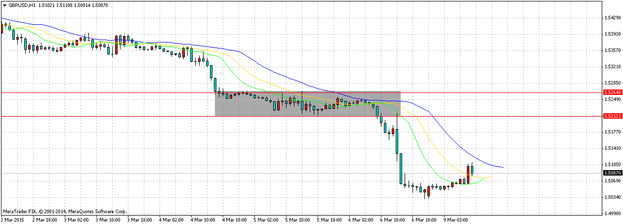 В пятницу были опубликованы показатели по количеству созданных рабочих мест в США, за февраль 2015 года. Показатели вышли на уровне 295 тис., Прогнозировался показатель в 240 тис. Положительные новости нашли своё отображение в движении валютной пары GBP/USD. Цена пробила уровень поддержки 1,5212 и начала своё стремительное снижение.