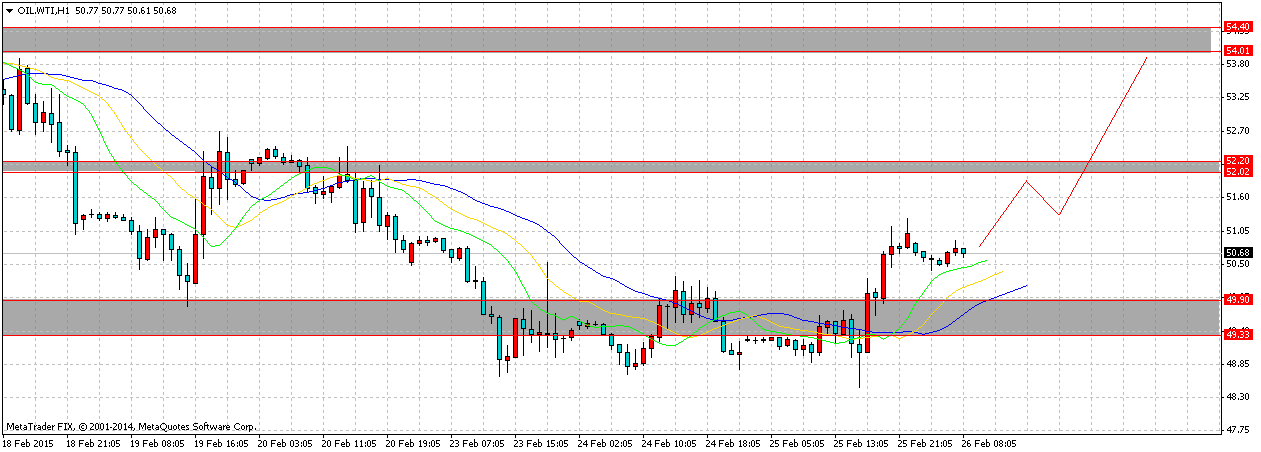 В данной ситуации более вероятным является продолжение восходящего движения. Считаю перспективным открытие блинных позиций со стопом за уровень 49.33. Первой целью станет уровень 52.02 после чего, на мой взгляд, следует ожидать небольшой отскок и продолжение движения до уровня 54.00.