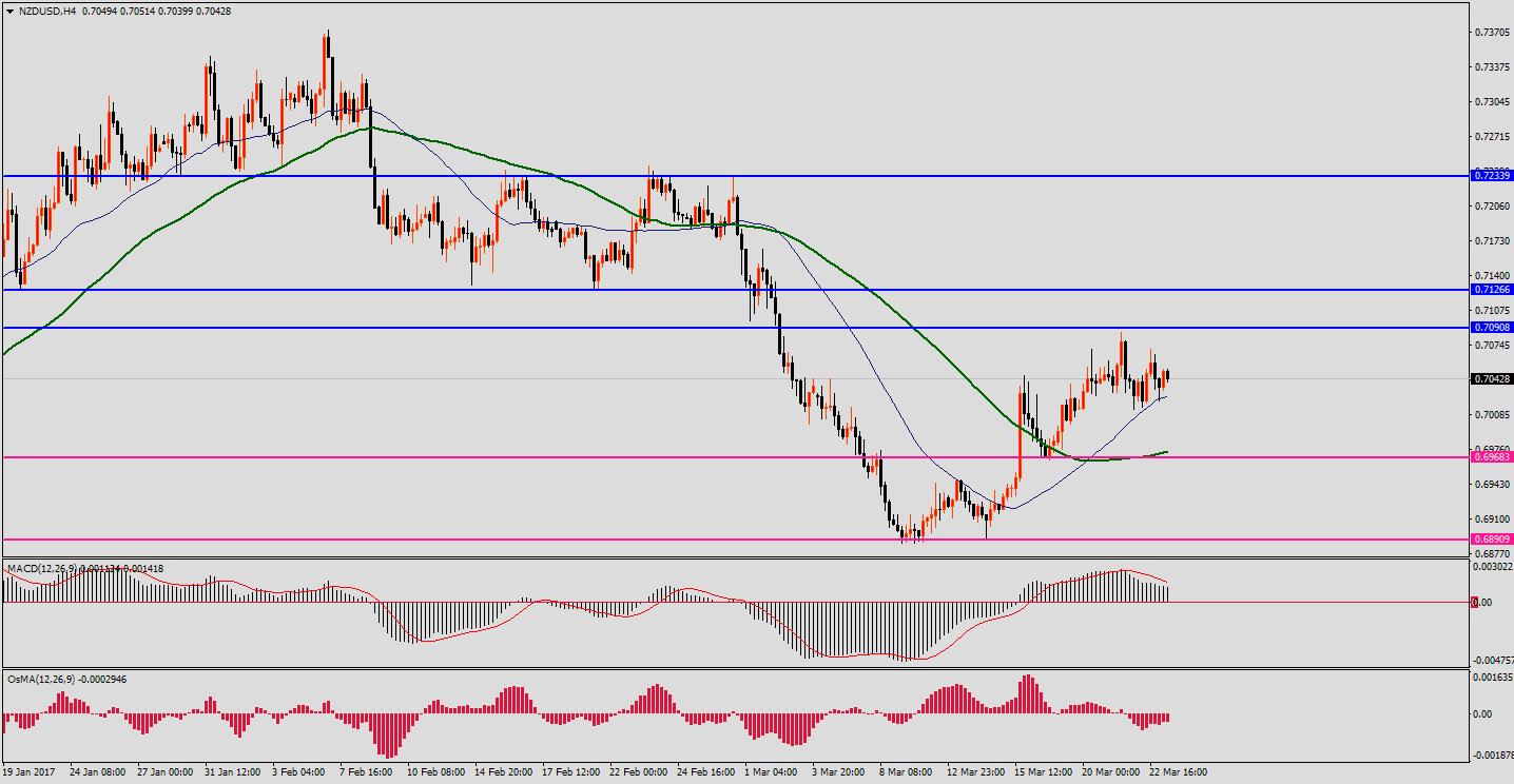 По состоянию на утро, 23 марта, NZD/USD торгуется в диапазоне 0,7031 — 0,7051. Ближайшей целью выступает уровень сопротивления 0,7090. Открытие ордеров на покупку стоит рассматривать после пробития уровня вверх.