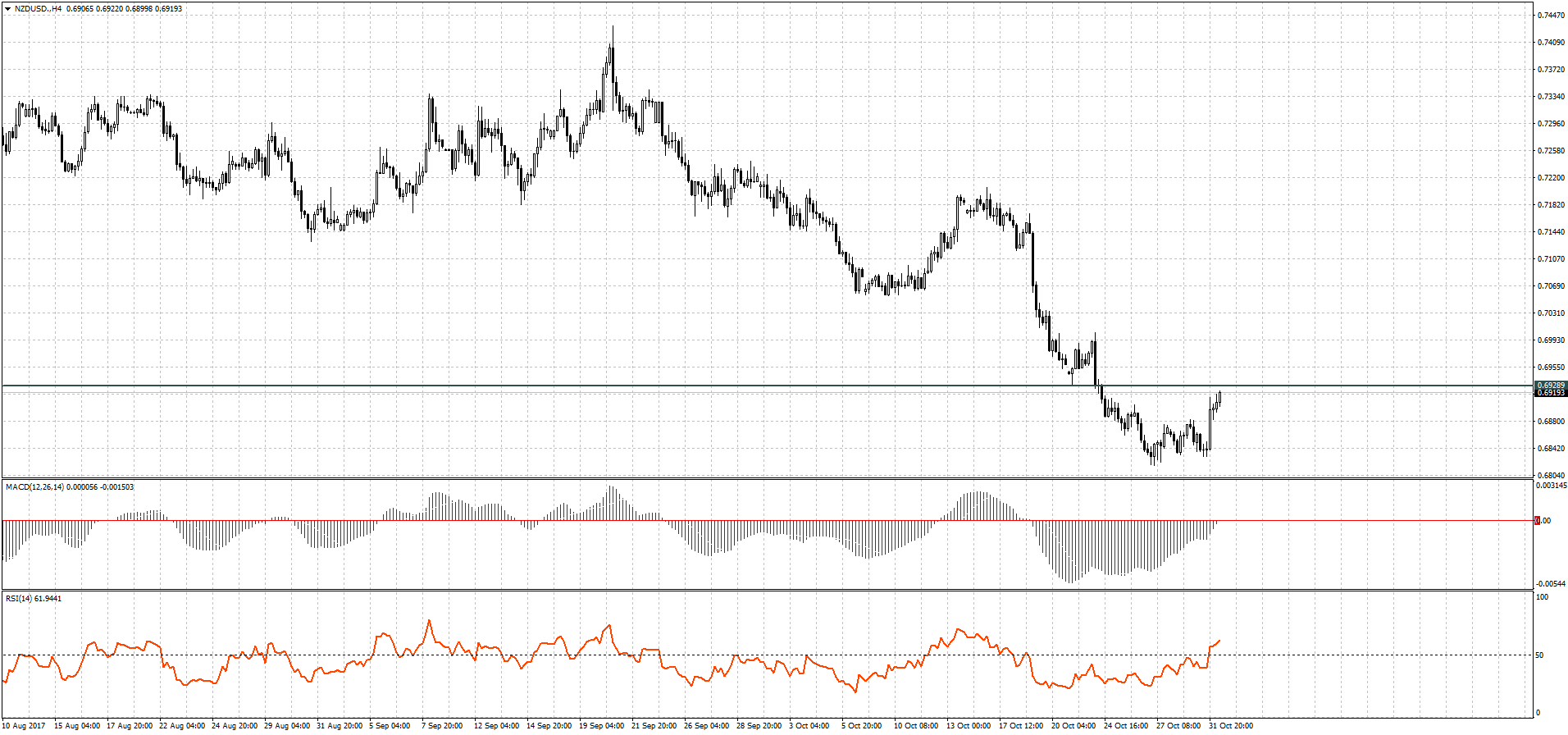 По состоянию на утро, 01 ноября, NZD/USD торгуется в диапазоне 0,6899 — 0,6920. На моменте валютная пара пребывает в стадии локального низходящего тренда. В случае пробития ближайшего уровня сопротивления 0,6928, открываем ордера на buy. Однако данного уровня возможен и разворот в сторону продолжения тренда.