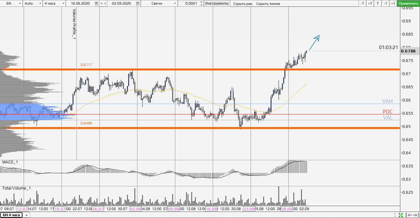 По состоянию на утро, 02 сентября, ценовая отметка по валютной паре NZD/USD торгуется в диапазоне 0,6748- 0,6786. Так как валютная пара вышла из зоны бокового канала, рассматриваем покупки. Фиксация цены над уровнем, стало сигналом к открытию сделок на покупку.