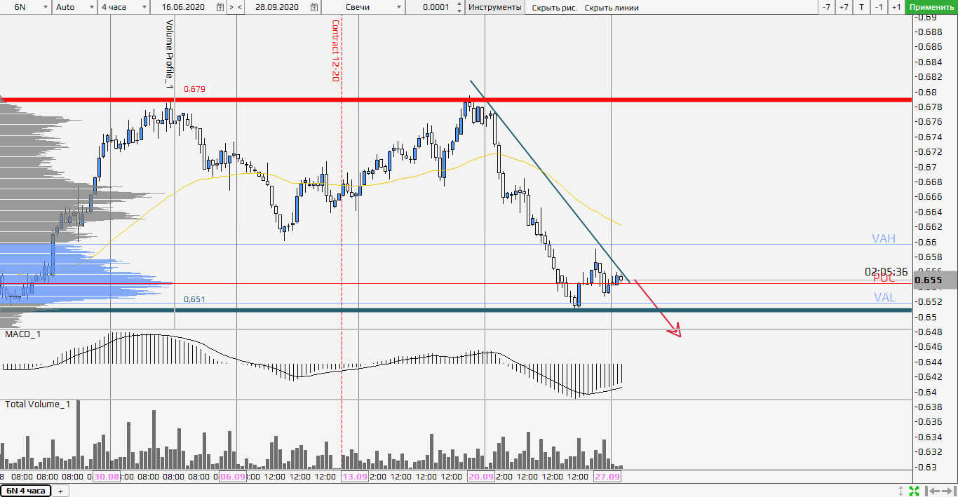 На текущий момент ценовая отметка инструмента находится в диапазоне 0,6543 - 0,6559. Для входа в рынок следует дождаться пробитие нижней границы консолицации с последующей фиксацией цены под уровнем.