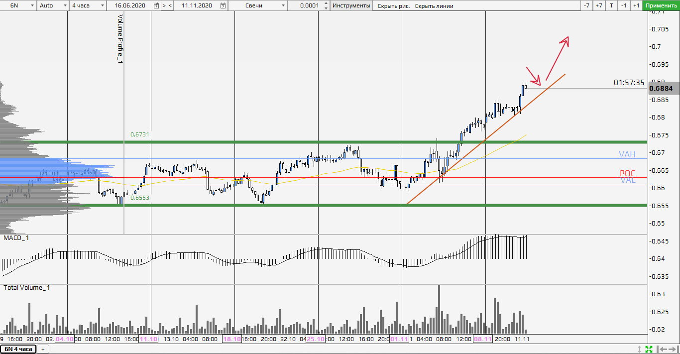 Валютная пара NZD/USD преодолела рамки бокового канала. На текущий момент, ценовая отметка инструмента находится в диапазоне 0,6865 - 0,6906. Рекомендуем торговать от линии поддержки.