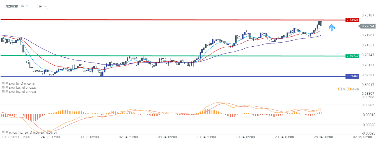Валютная пара NZD/USD торгуется в рамках равноудалённого бокового канала. Как сообщило сегодня Статистическое управление Новой Зеландии, в марте положительное сальдо торгового баланса Новой Зеландии составило 33 миллиона новозеландских долларов. Это следует за пересмотренным в сторону повышения профицитом в 201 млн. Новозеландских долларов в феврале (первоначально 181 млн. новозеландских долларов).