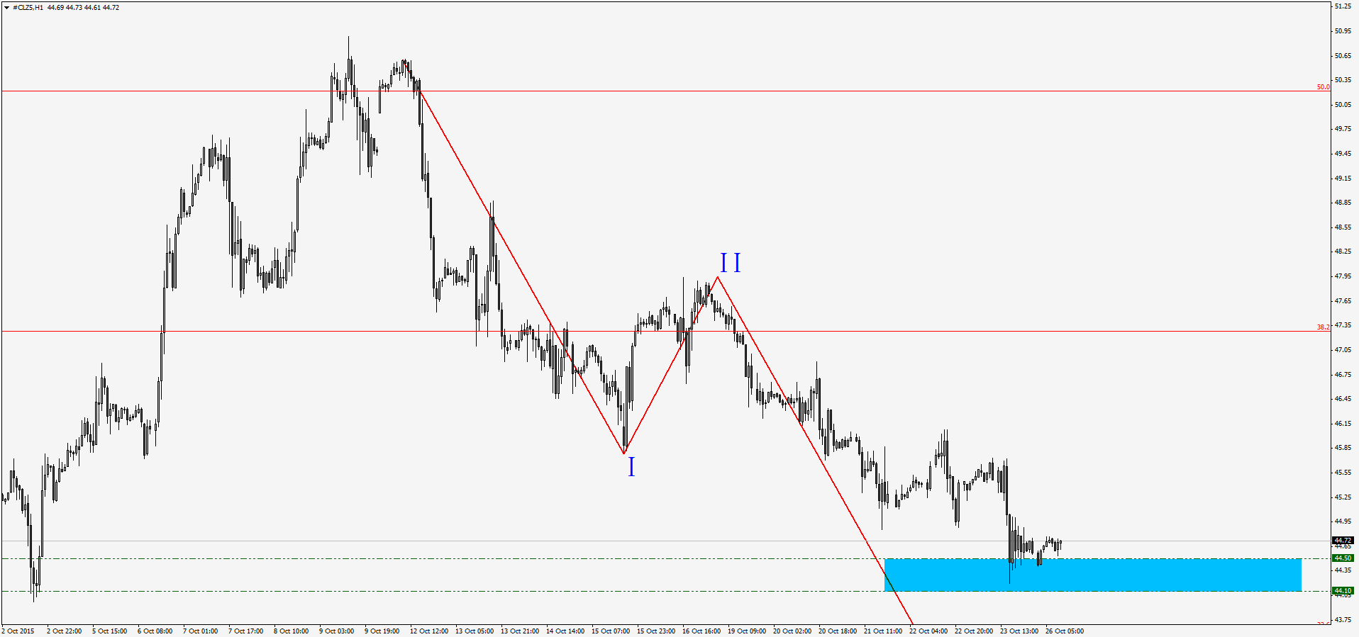Черное золото продолжает падать уверенно рисуя третью волну. В данной рыночной ситуации цена дошла к сильным уровням, которые являются поддержкой – это 44.50 и 44.10. Пробой и фиксация ниже выделенных уровней даст нам уверенность, что медвежье движение будет продолжено.