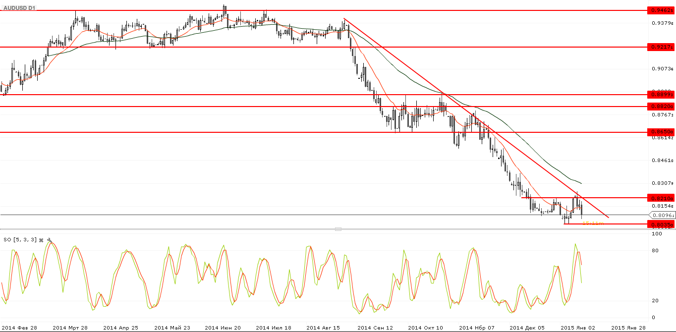 Австралийский доллар смог пробить и закрепится выше линии нисходящего тренда от 17.11.2014 года, но закрепить пару выше уровня сопротивления 0,8210 быкам так и не удалось. Если взглянуть на дневной график, то видно, что пара AUD/USD отскочила от более значимой линии нисходящего тренда, начавшего свое формирование еще 05.09.2014 года.
