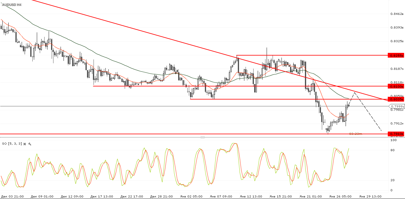 Австралийский доллар пытается закрепиться выше уровня 0,8000. При продолжении восходящей динамики дальнейшим сопротивлением послужит уровень 0,8035 и линия нисходящего тренда. В данный момент торги проходят выше Moving Average с периодом 13, но ниже выше Moving Average с периодом 55, что свидетельствует о неопределенности участников рынка. Осциллятор Stochastic направлен вверх, но находится вблизи зоны перепроданости.