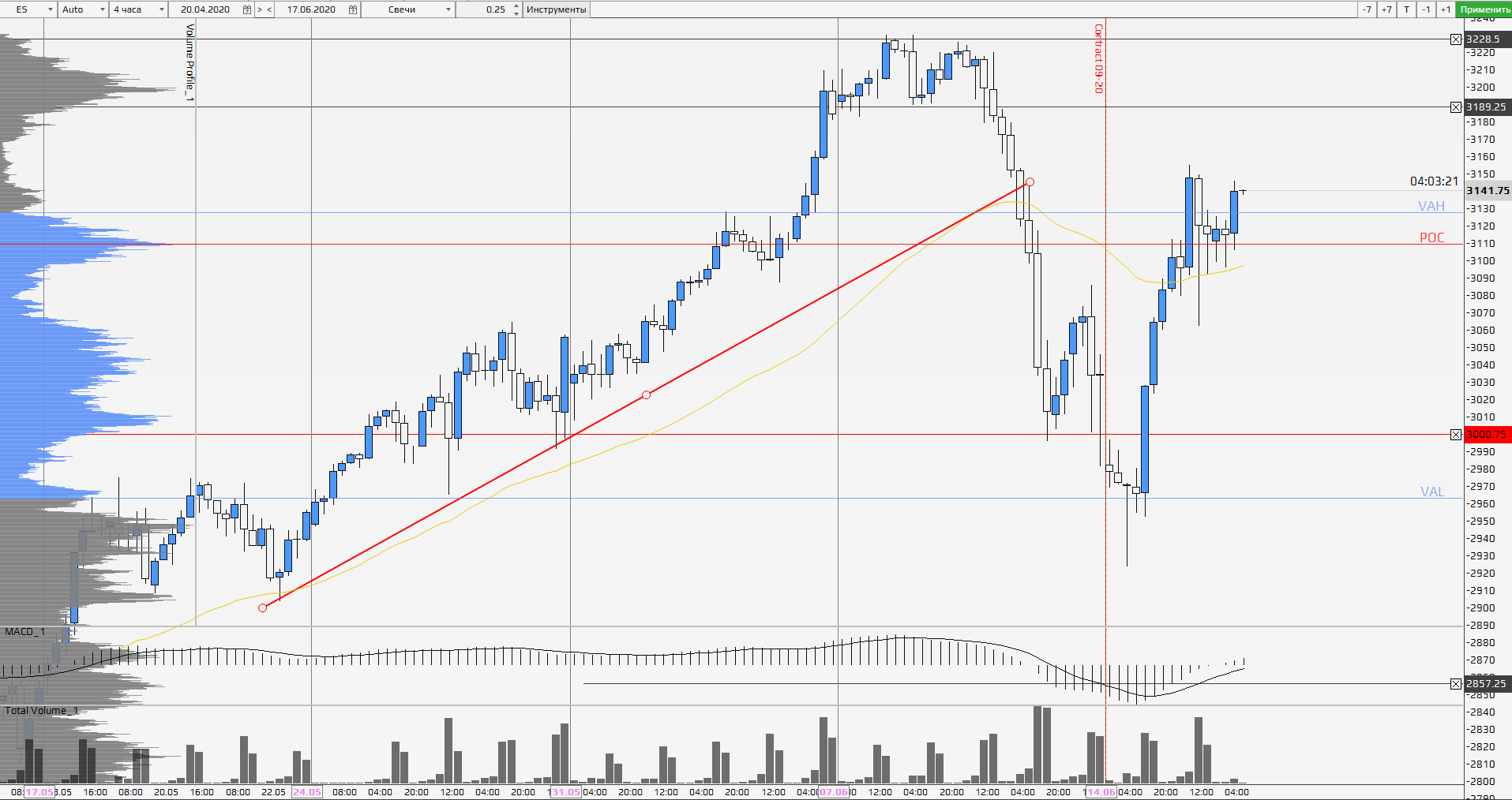 Фондовый индекс SP500 сильно скорректировался в конце прошлой неделе, а текущая неделя началась с роста. Стоит заметить, что линия восходящего тренда была пробита. На текущий момент цена идет на тест объёмного сопротивления 3228 – 3189 и стоит ждать еще одну волну роста вверх с текущих цен, после чего давление продавцов может возобновиться, и цена начнет падать. Ключевая поддержка покупателей расположена в районе отметки 3000. В случае, если котировки опустятся ниже данной отметки мы увидим начало распродажи и падение в район отметки 2800.