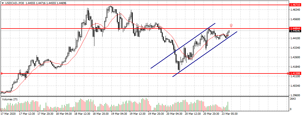 По состоянию на утро, 23 марта, ценовая отметка по валютной паре USD/CAD торгуется в диапазоне 1,4400 - 1,4486. Так как цена пребывает в рамках восходящей тенденции, рассматриваем открытие сделок на покупку. Таргет отметка 1,4671.