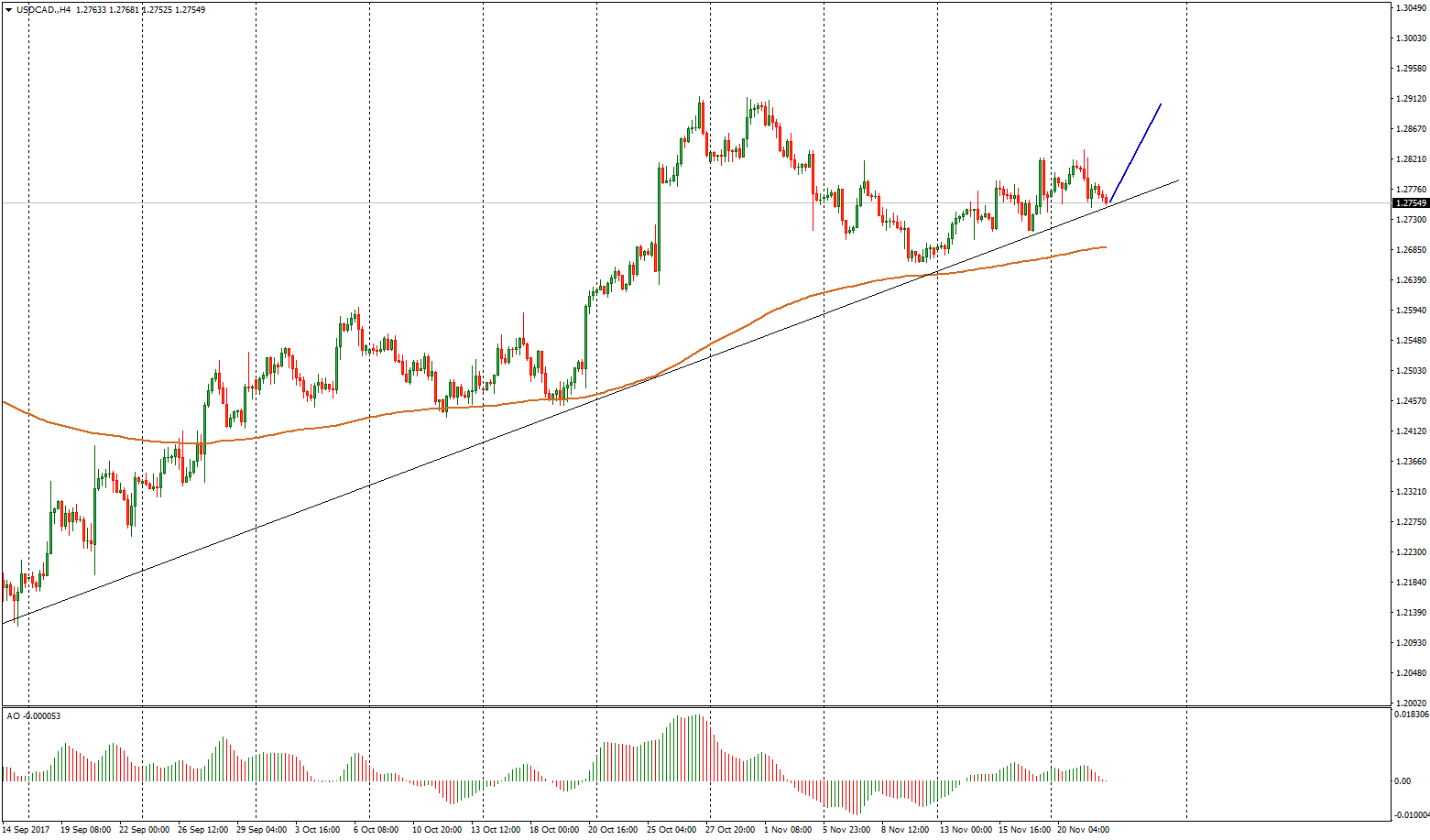 По состоянию на утро, 22 ноября, ценовая отметка по валютной паре USD/CAD находится в диапазоне 1,2752 — 1,2768. На моменте рассматриваем открытие ордеров на покупку, так как валютная пара пребывает в локальном восходящем тренде. Однако, если линия поддержки и мувинг будут пробиты, возможен шорт.