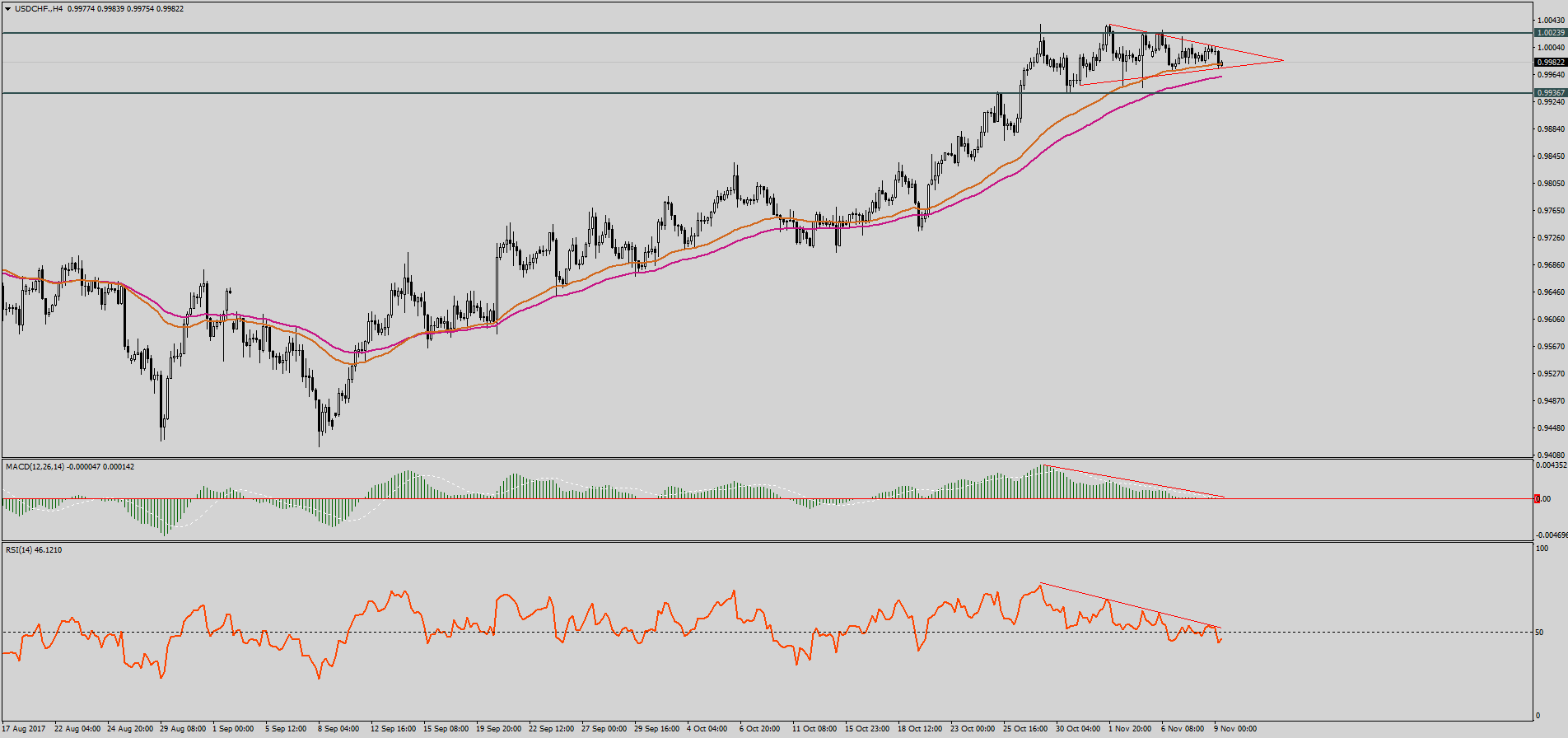 По состоянию на утро 09 ноября USD/CHF торгуется в диапазоне 0,9976 — 0,9983. В данный момент на 4Н графике сформировалась фигура восходящего клина. Что говорит о вероятном завершении восходящей тенденции и дает нам возможность заключать сделки на продажу после пробития нижней трендовой линии. Технические индикаторы также дают сигнал к продаже.